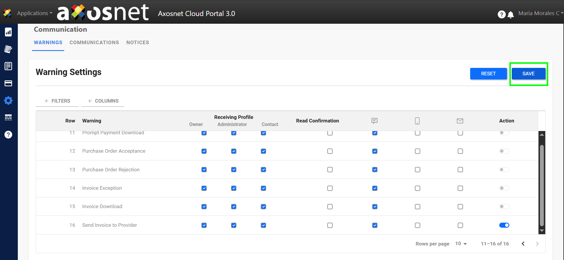 To save the changes in the Warnings section we only have to select the profile that receives, the read confirmation and the means by which the warning will arrive. Click SAVE and this will be the new warning configuration.