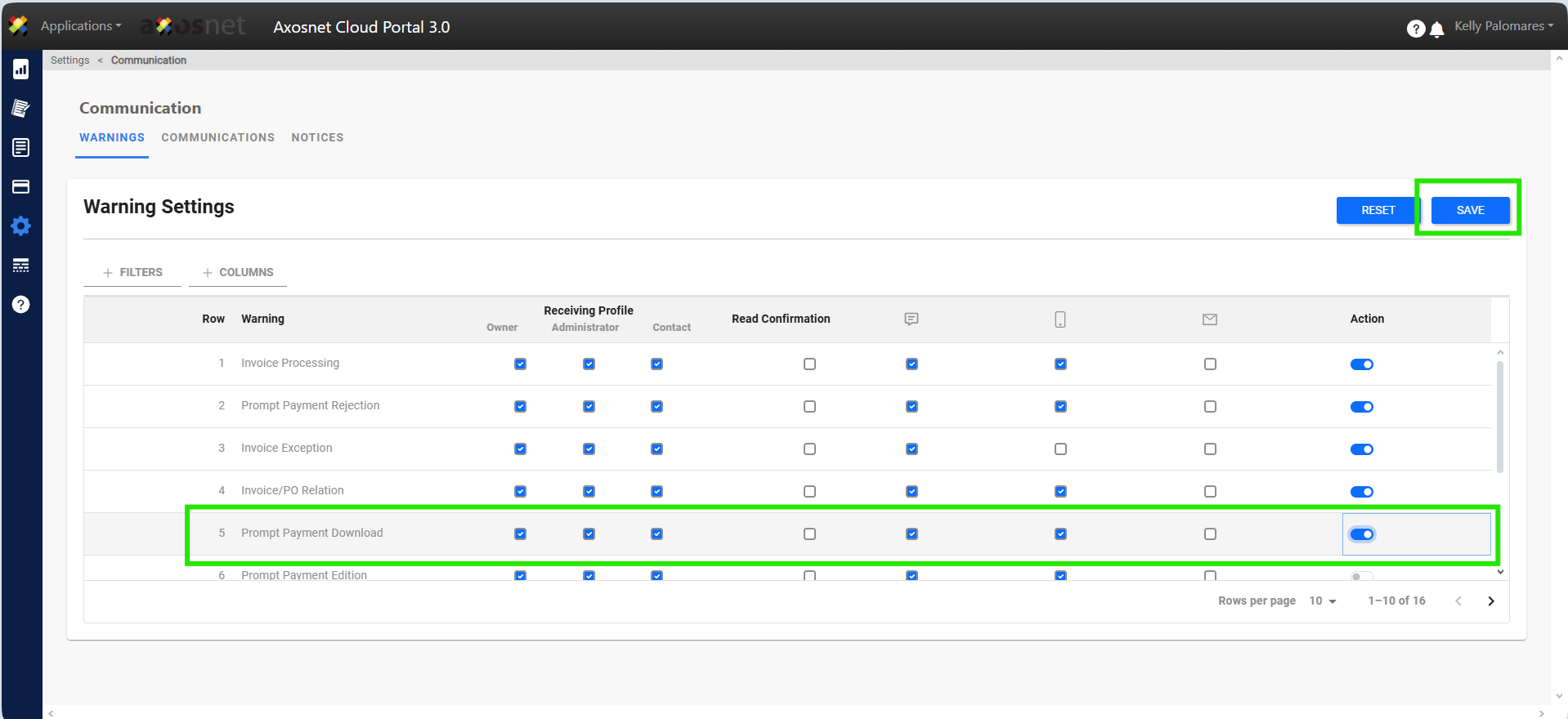 In this section we can select which warnings will be activated and we can choose the means by which they reach the end user. Once you have selected the options that you want to activate or deactivate, click SAVE.