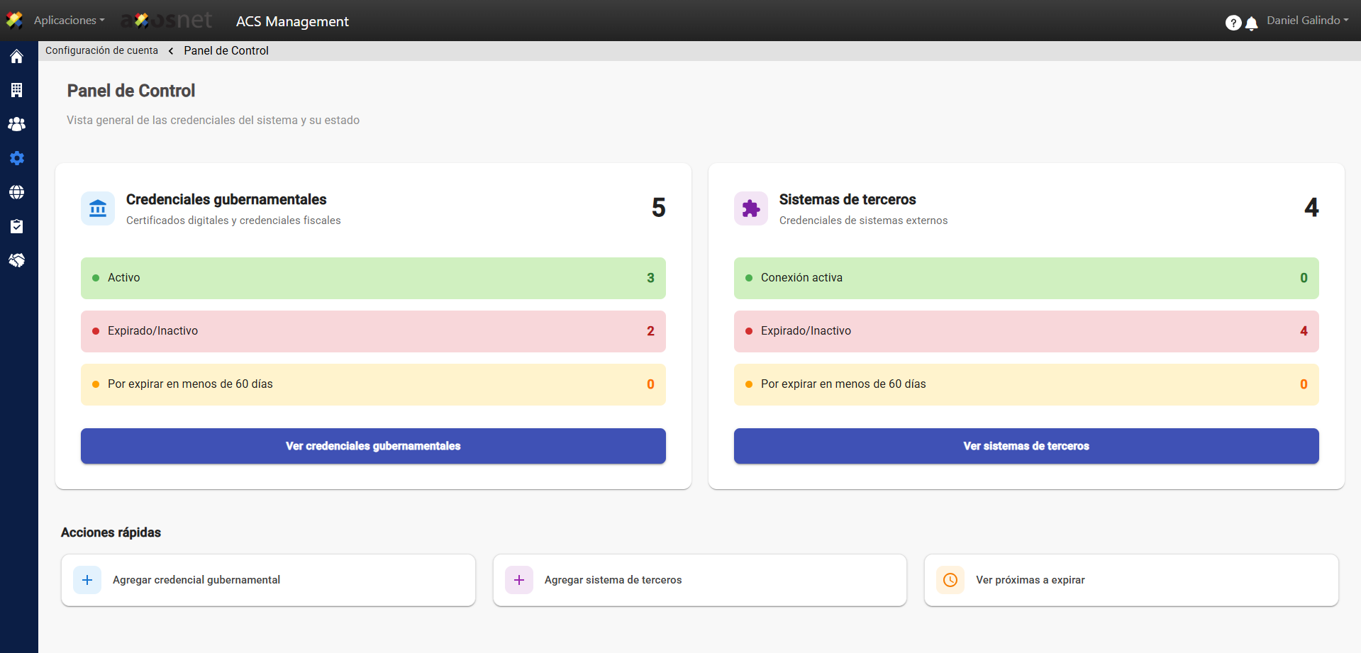 En la sección de Acceso de Servicios a Terceros verá dos secciones que son Credenciales Gubernamentales y Sistemas de Terceros con la cantidad total de cada una y un desglose de Activos, Expirados y Por Expirar.