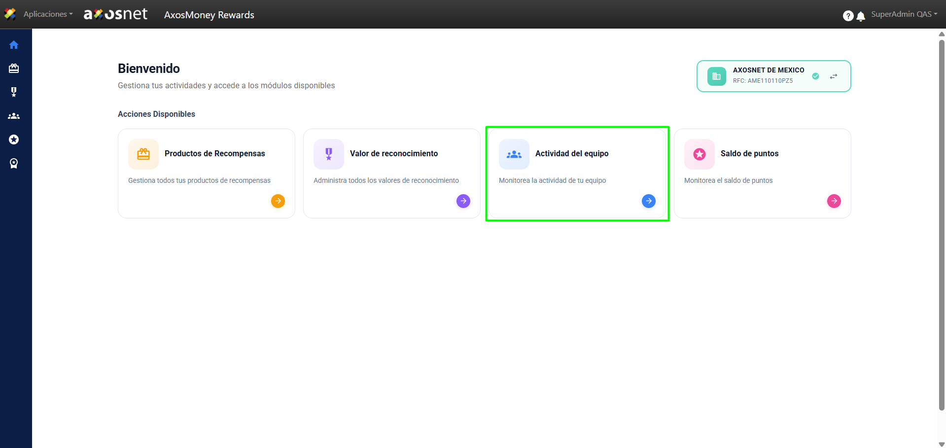 El super administrador podrá consultar las actividades realizadas de un equipo desde la página ACS por medio del aplicativo AxosMoney Rewards.
