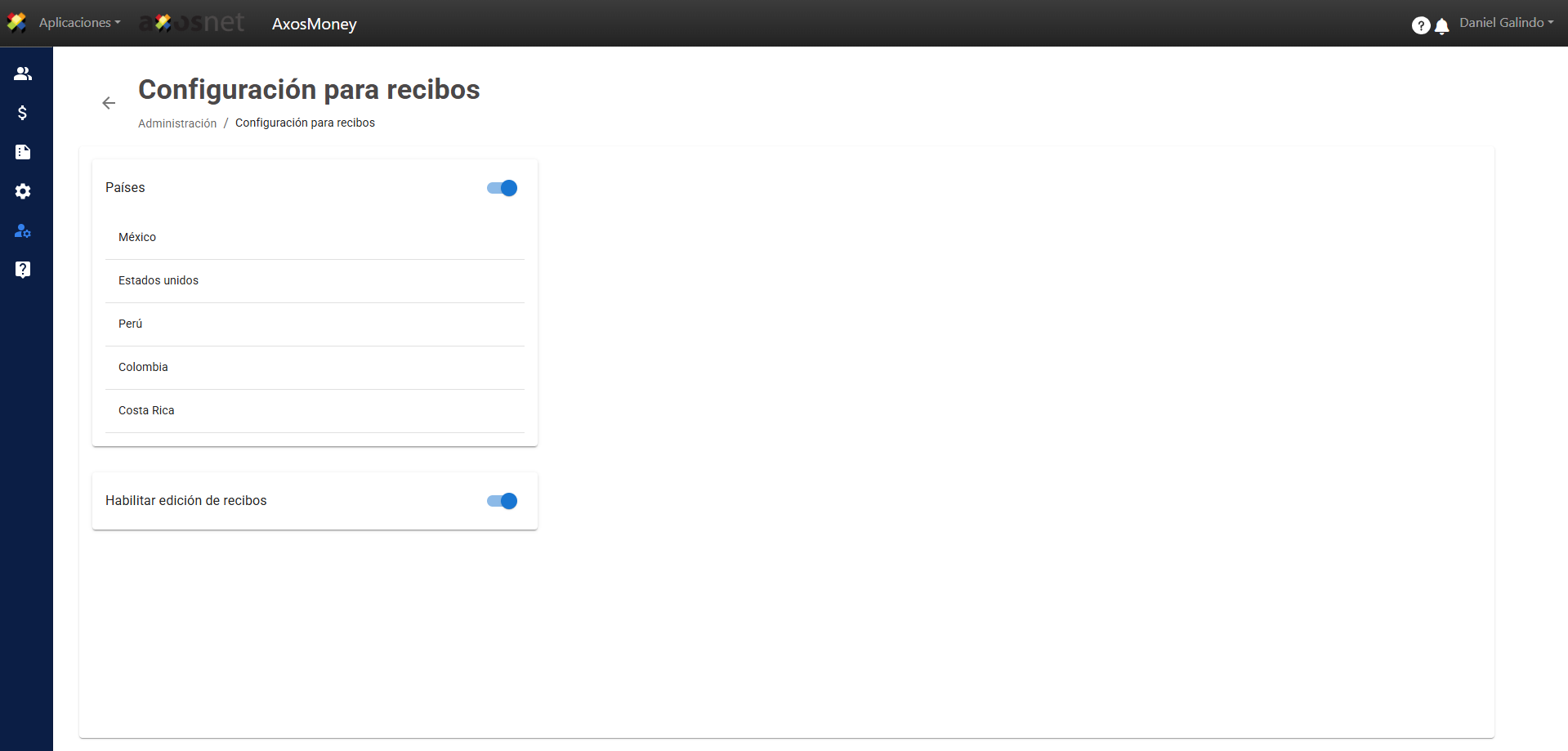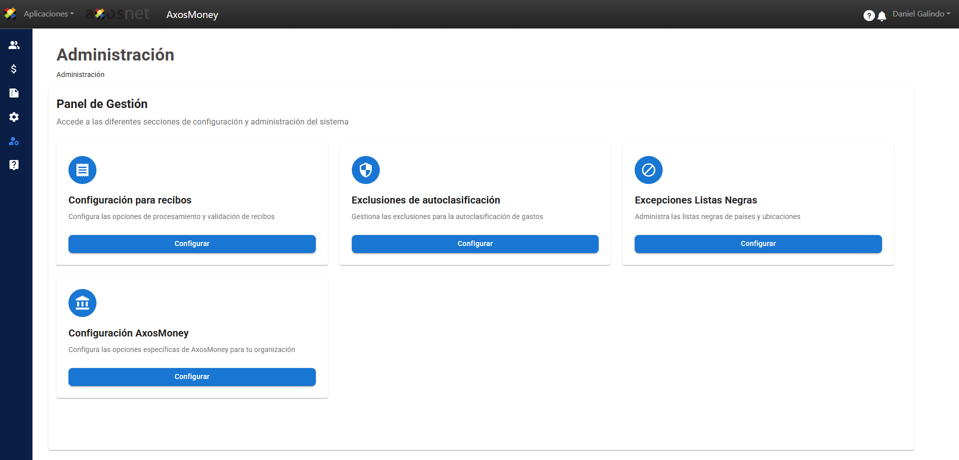 Al entrar a la Administración de AxosMoney podrá ver las siguientes secciones de configuración y administración del sistema. Más adelante se explica a detalle en que consiste cada una de ellas.