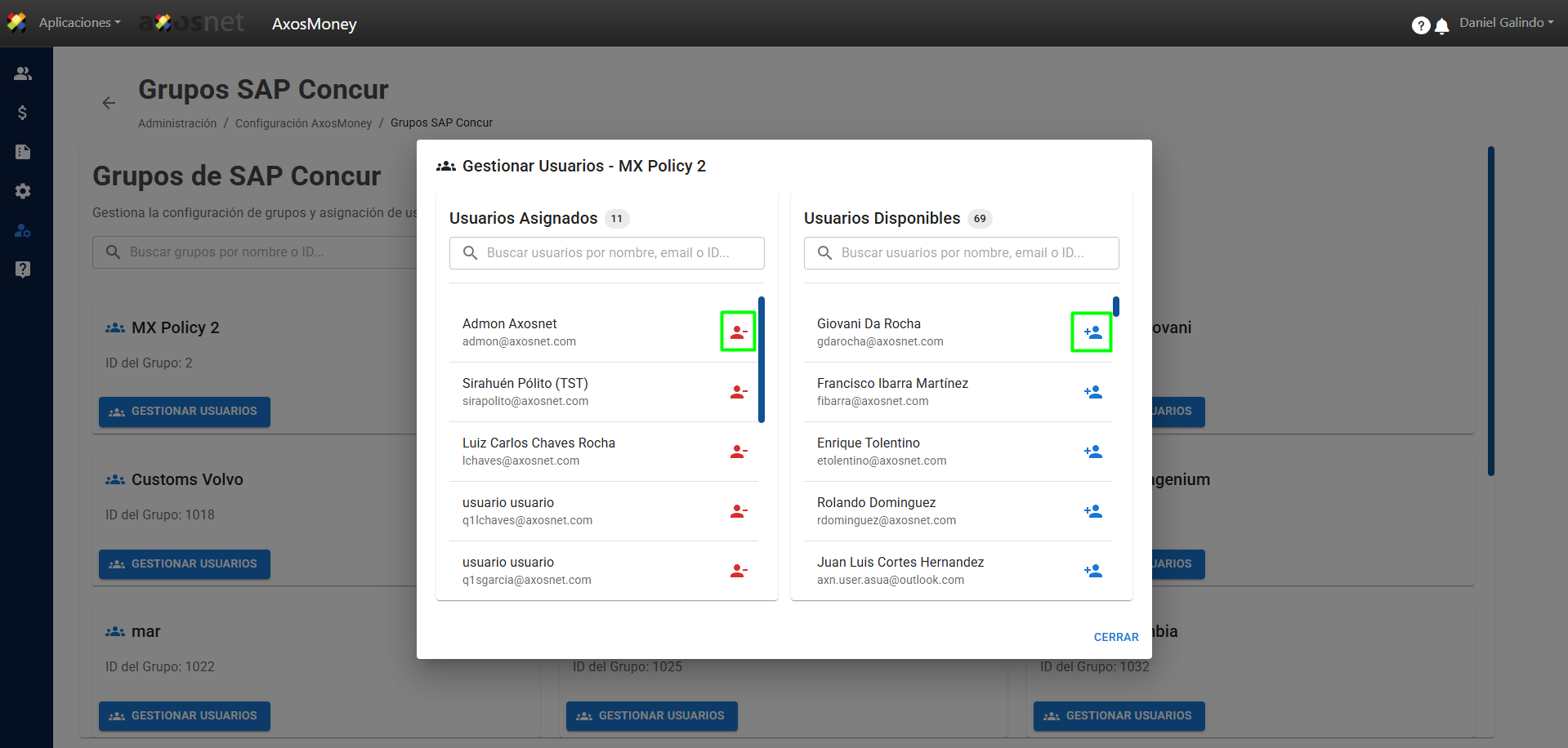 Para remover un usuario del grupo solo haga clic sobre el icono de color rojo en la parte de Usuarios Asignados, así como se muestra en la imagen, de la misma manera podemos agregar usuarios haciendo clic en el icono azul en la parte de Usuarios Disponibles.