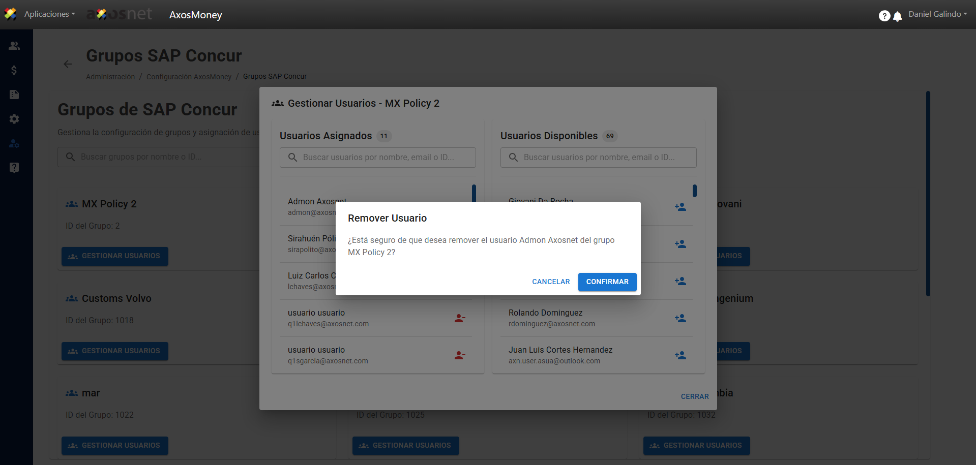 5. Al remover o asignar usuarios a un grupo aparecerá una ventana emergente para confirmar la acción.