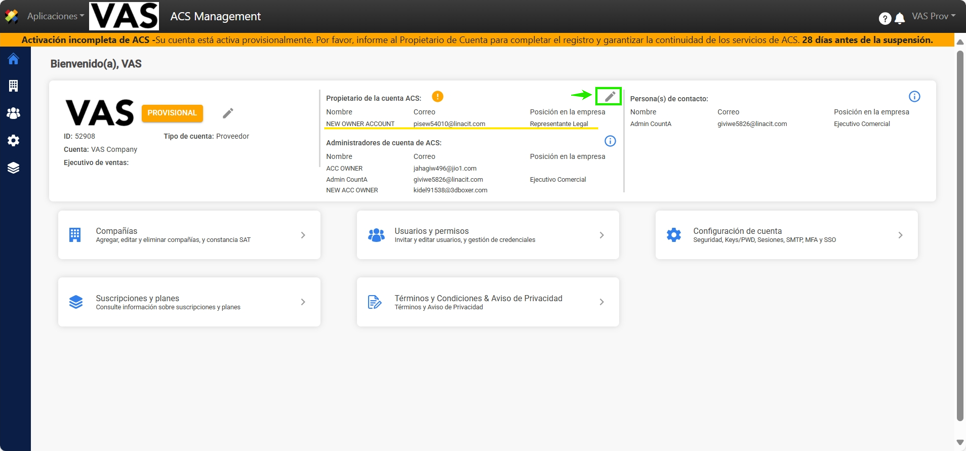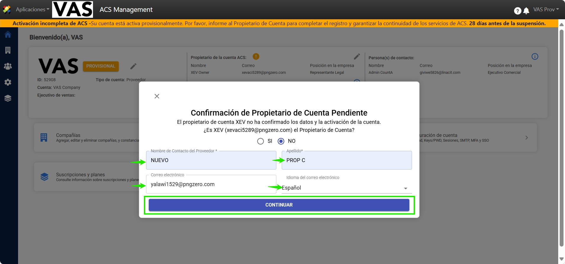 Cambiar Propietario de Cuenta Provisional