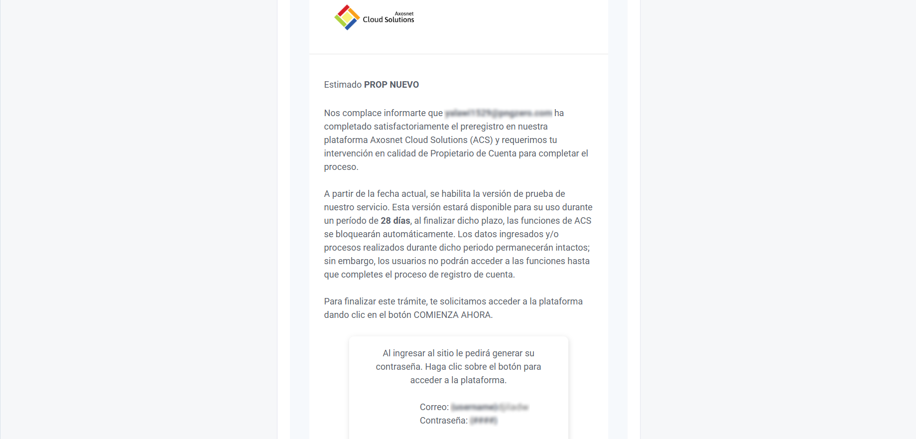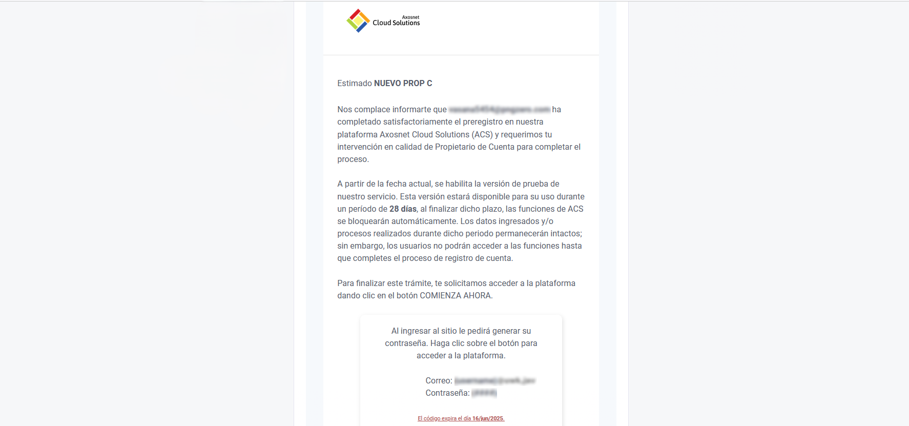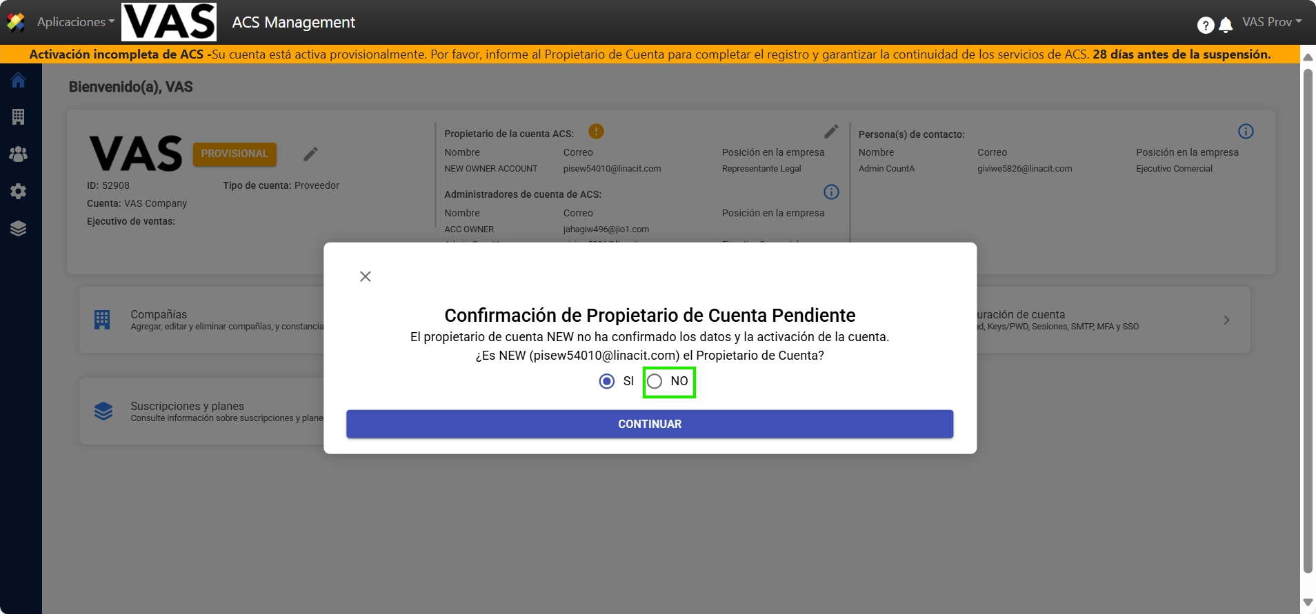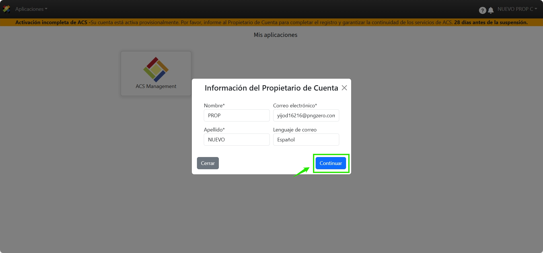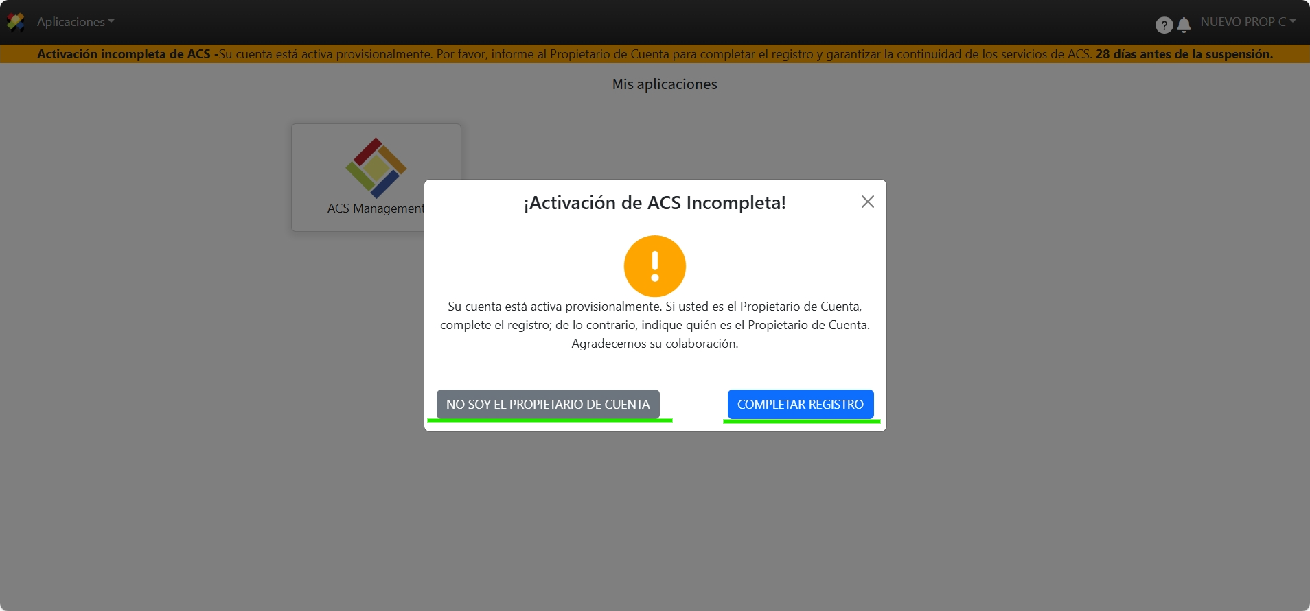 Cuando el usuario registrado como Propietario de Cuenta inicie sesión en ACS Management, la página solicitará la selección de alguna de las 2 opciones según corresponda cada caso: “No soy Propietario de Cuenta” y “Completar Registro”. A) No soy Propietario de Cuenta 1. Haga clic sobre No soy el Propietario de Cuenta” 2. Registre la información correspondiente del Propietario de Cuenta y haga clic sobre Continuar. 3. El Propietario de Cuenta propuesto recibirá el correo de invitación. B) Completar Registro 1. Diríjase a la sección Completar Registro y siga los pasos para completar exitosamente el registro de activación de cuenta.
