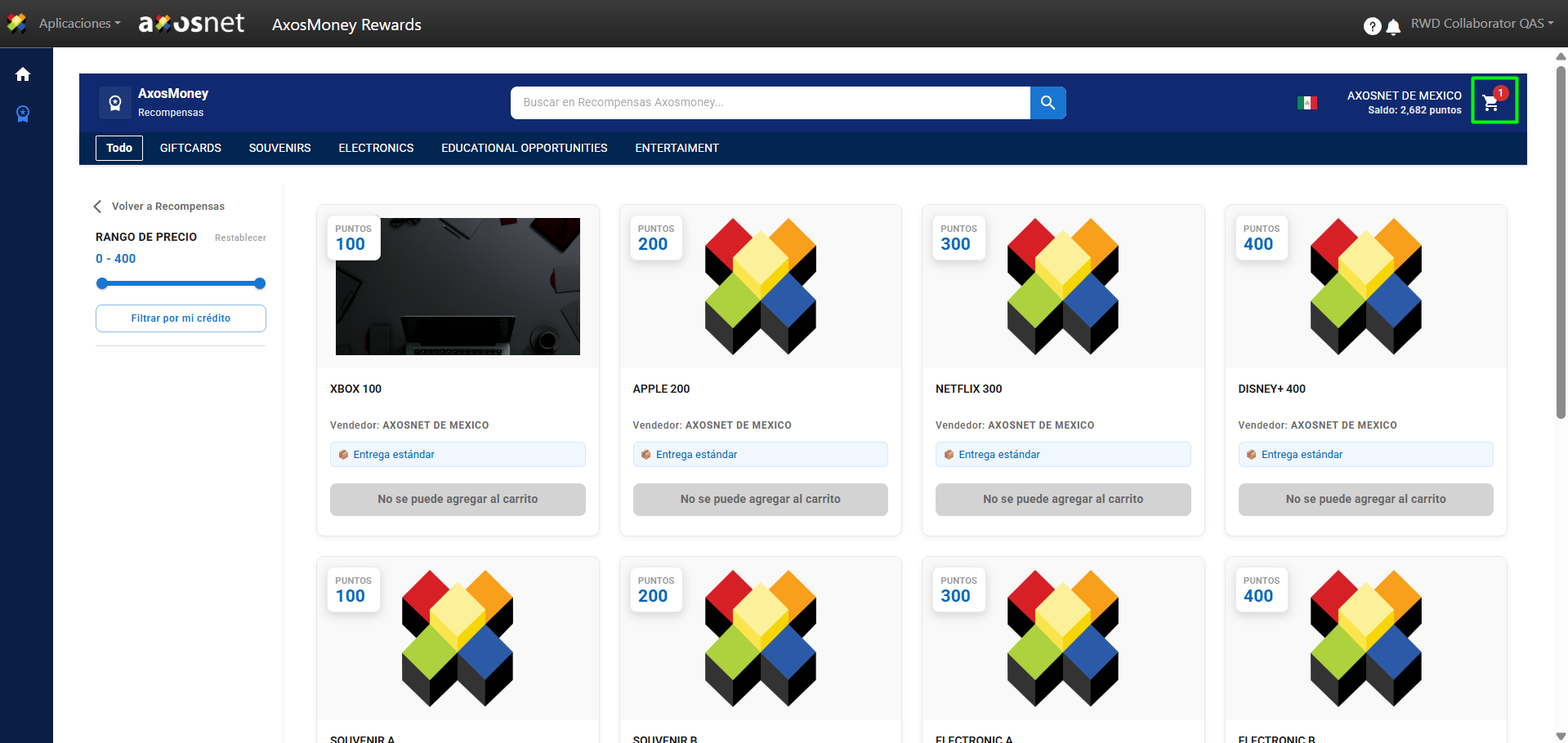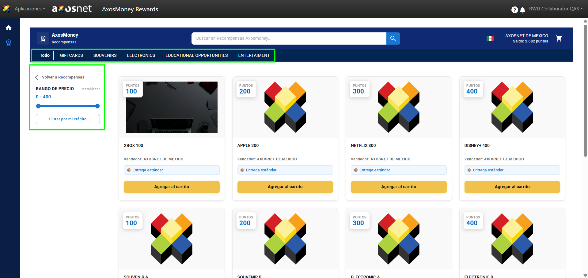 Nota: Es posible filtrar los productos por categoría en la parte superior o por su precio en puntos con el filtro del menú lateral izquierdo.