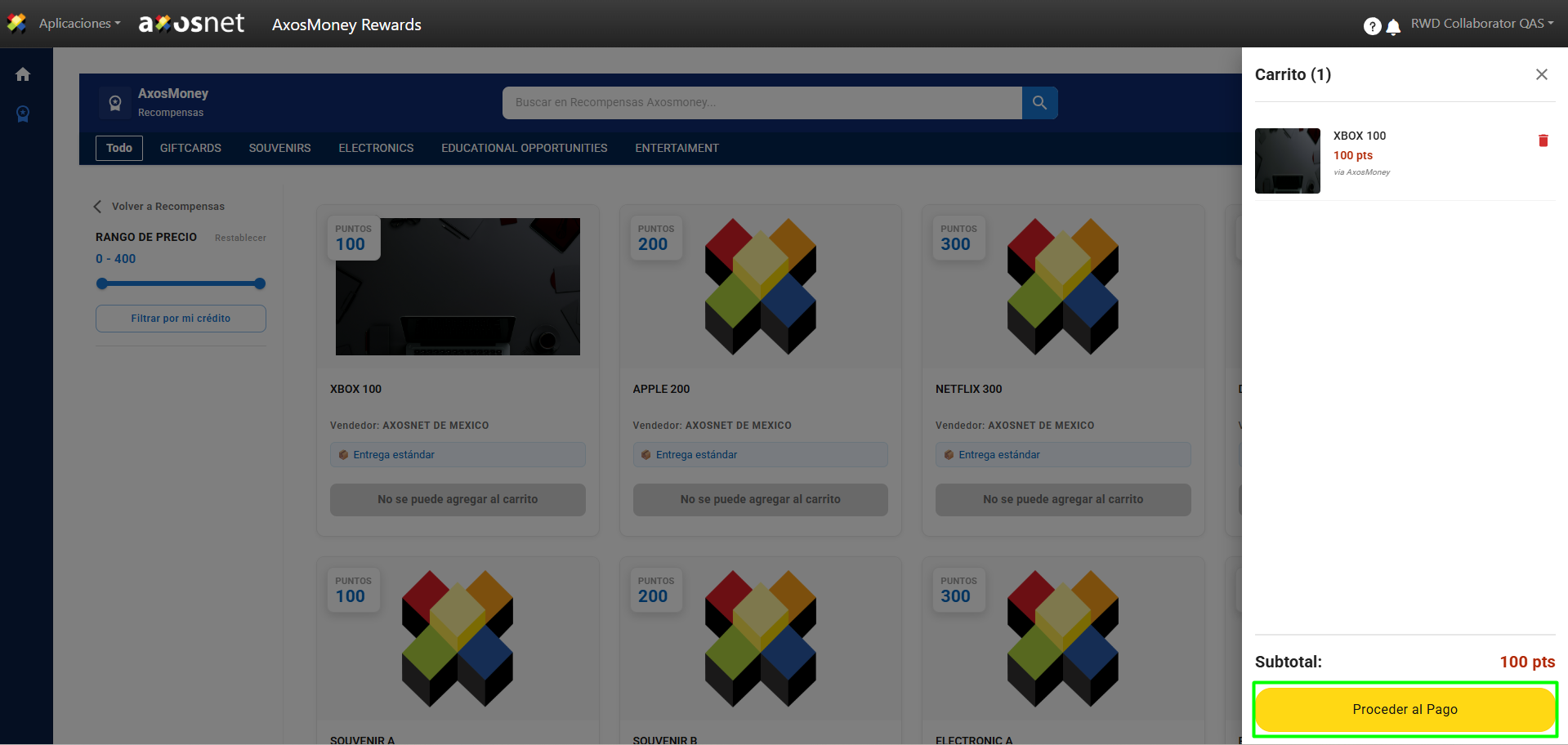 6. Para continuar con el proceso de canje, acceda al ícono del carrito de compras y seleccione la opción Proceder al pago.