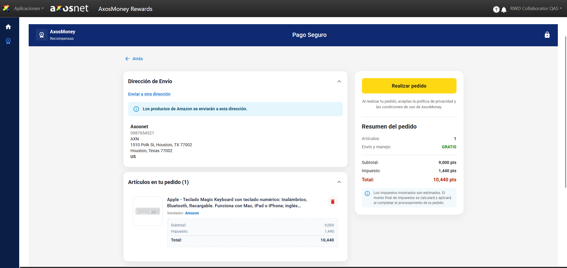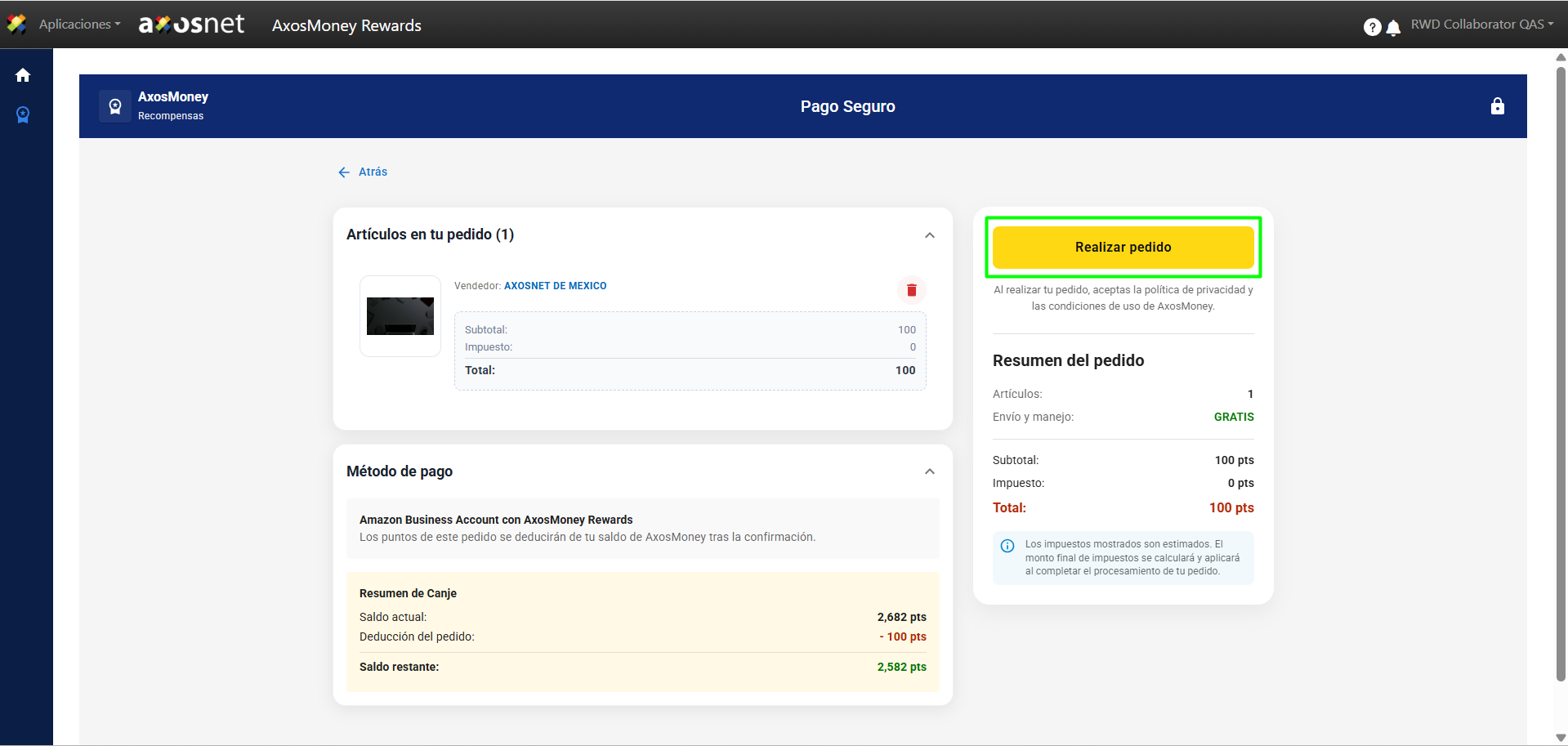 7. Para confirmar el canje de la recompensa, haga clic en Realizar Pedido.