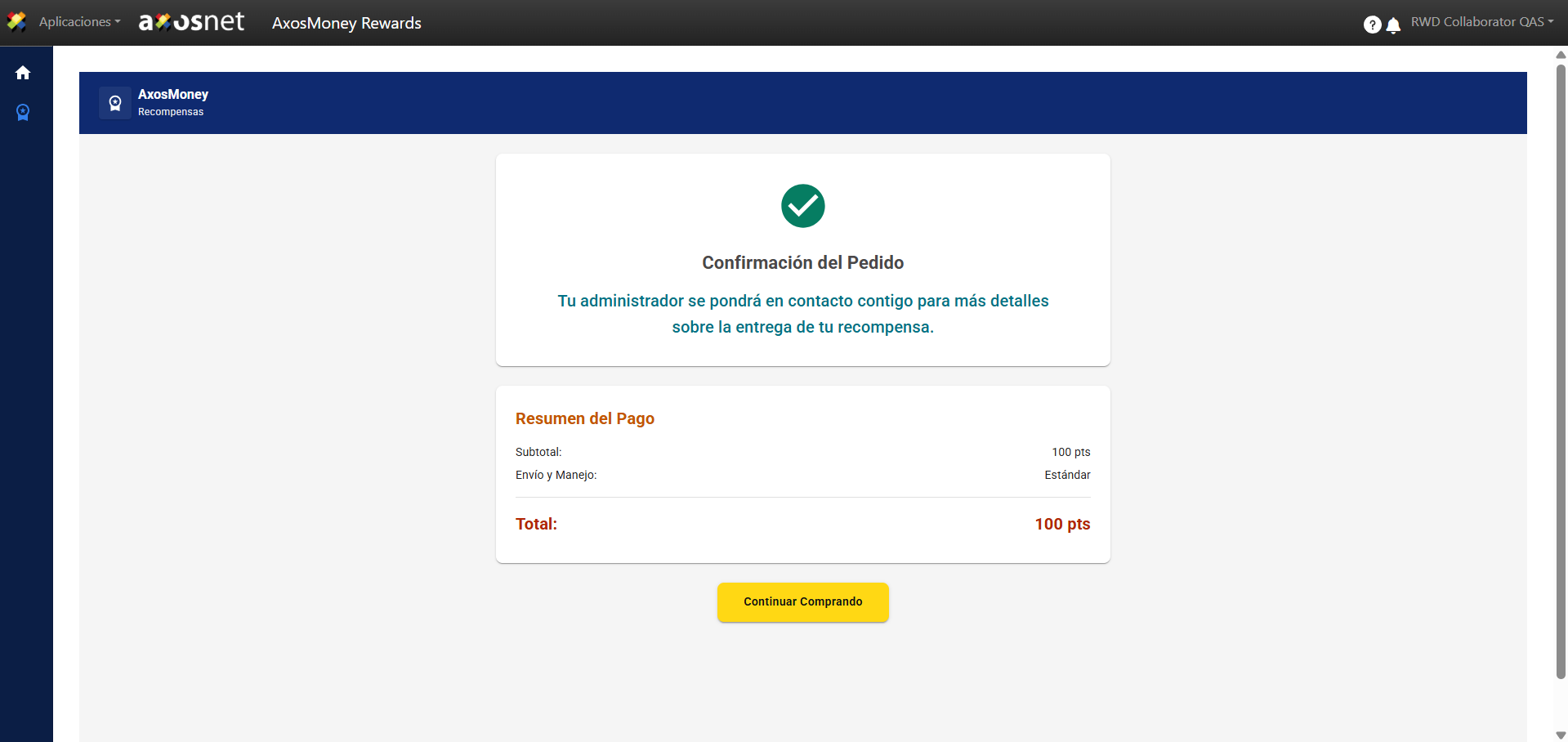 En la sección de AxosMoney Rewards, el Colaborador puede utilizar sus puntos acumulados para canjearlos por diferentes recompensas. Estas recompensas incluyen Souvenirs, Tarjetas de Regalo, Cursos, o la posibilidad de seleccionar un artículo de un catálogo predefinido de Amazon Business.