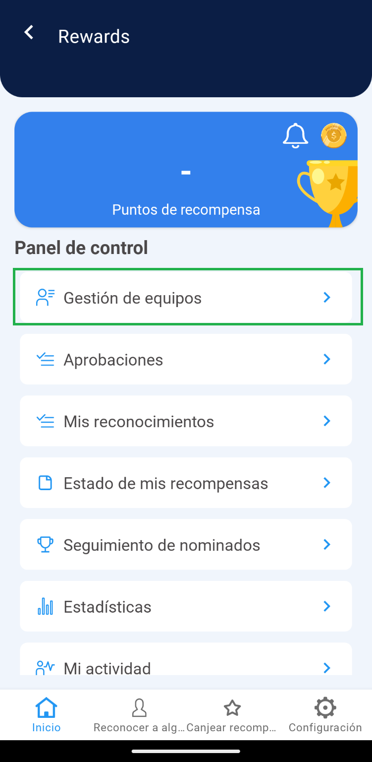 1. Dentro del panel de control de Rewards, seleccione la opción de “Gestión de equipos”.