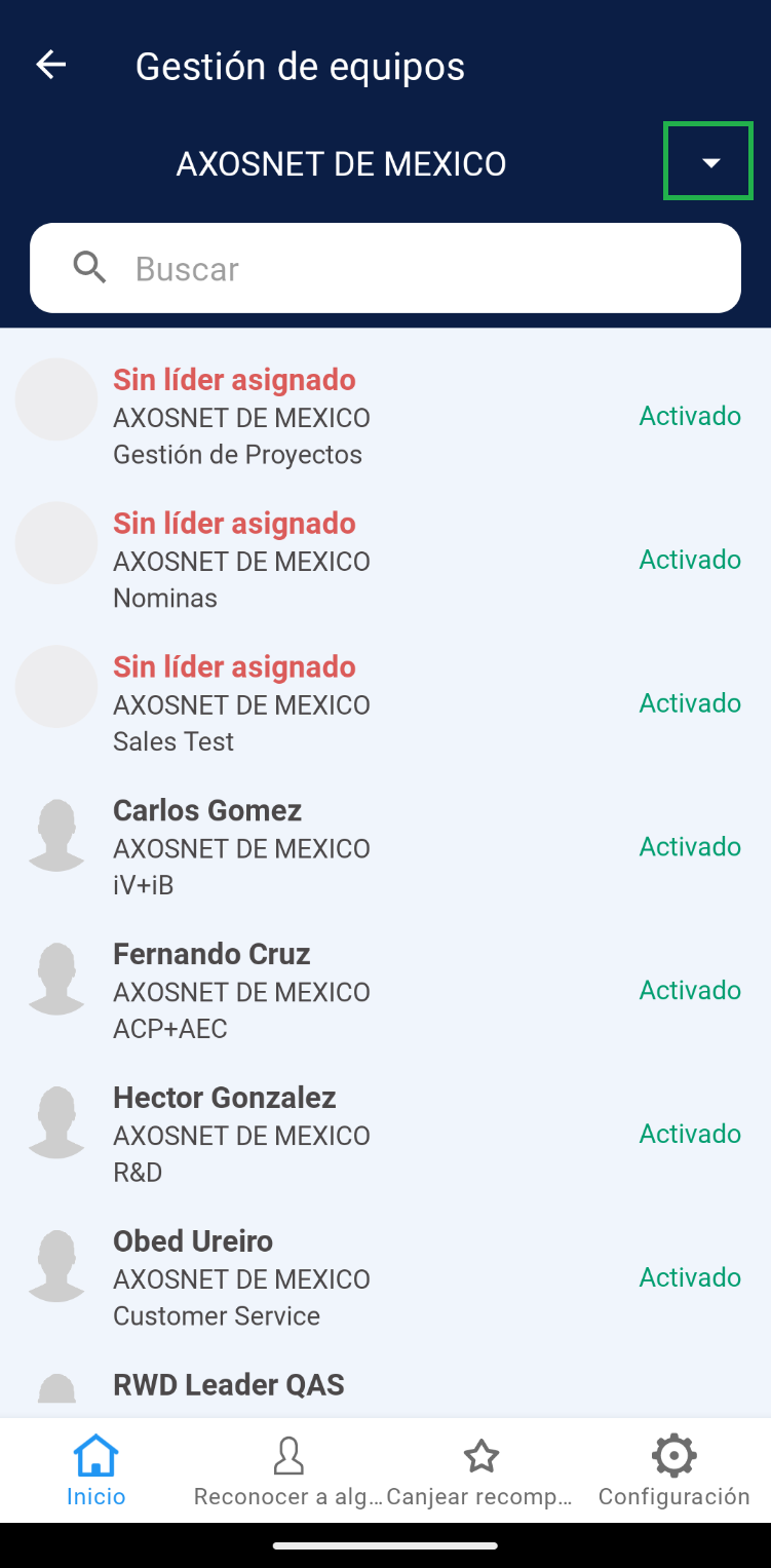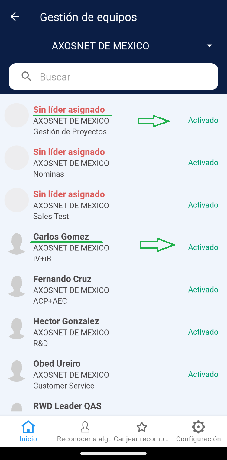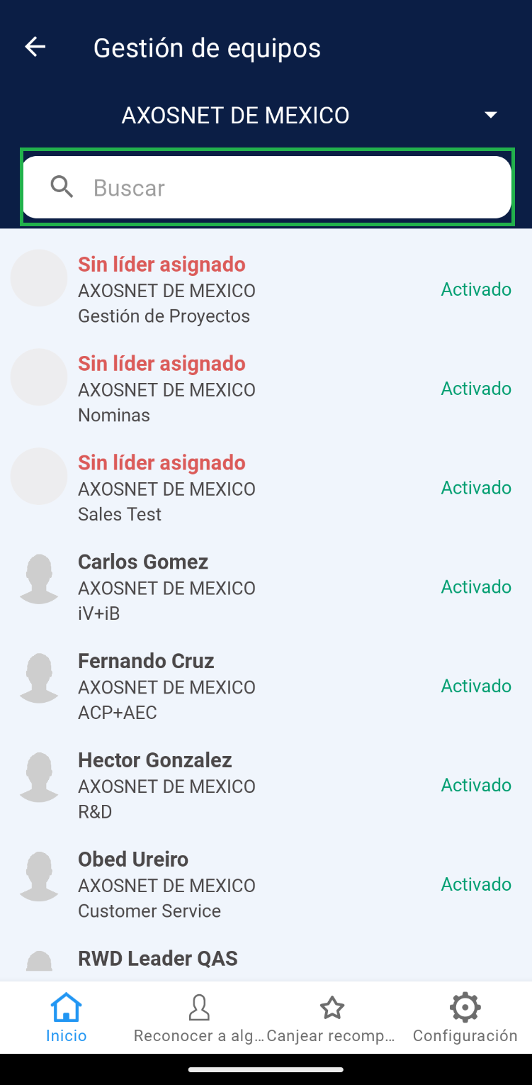 3. Podrá visualizar la lista de todos los equipos, resaltando en negritas el nombre del líder asignado y el estatus de activación de cada uno. Seleccione uno de los equipos disponibles del listado.