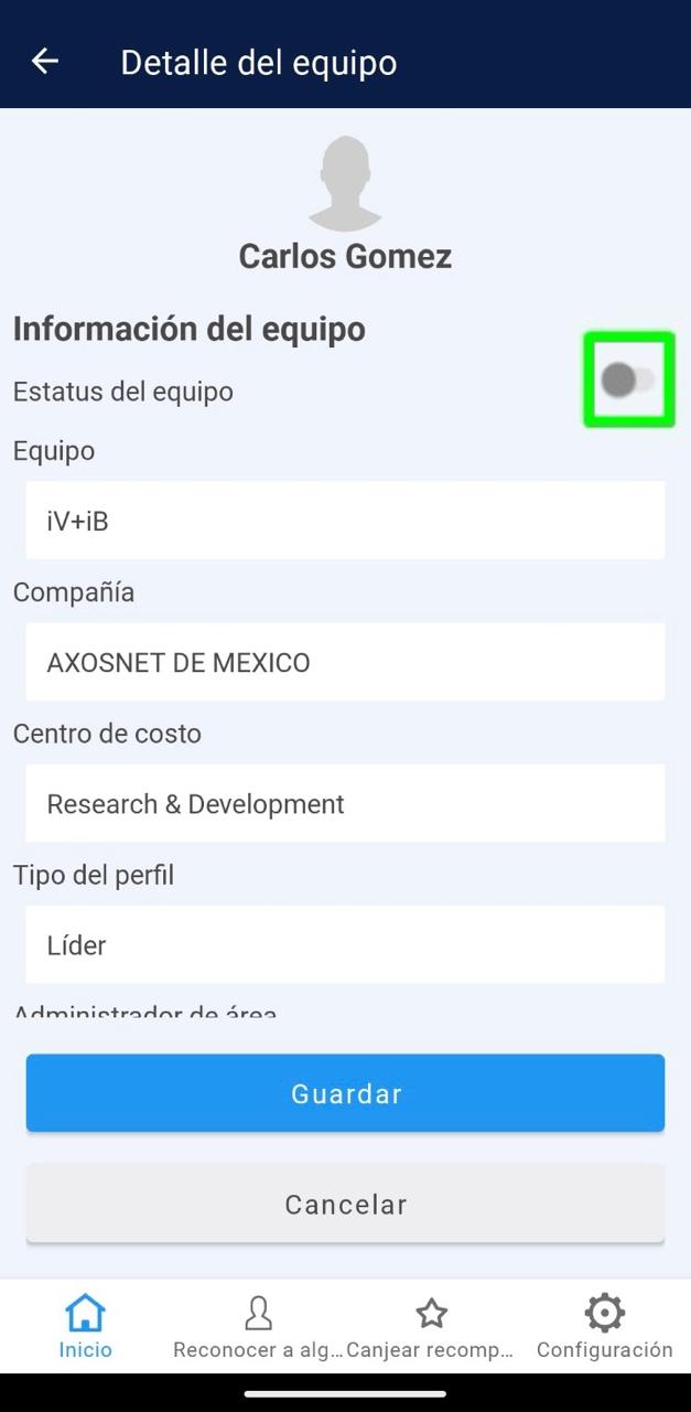 5. Si requiere desactivar al equipo, haga clic sobre el switch de modo que quede en color gris, de lo contrario active al equipo dejando el switch en color verde.