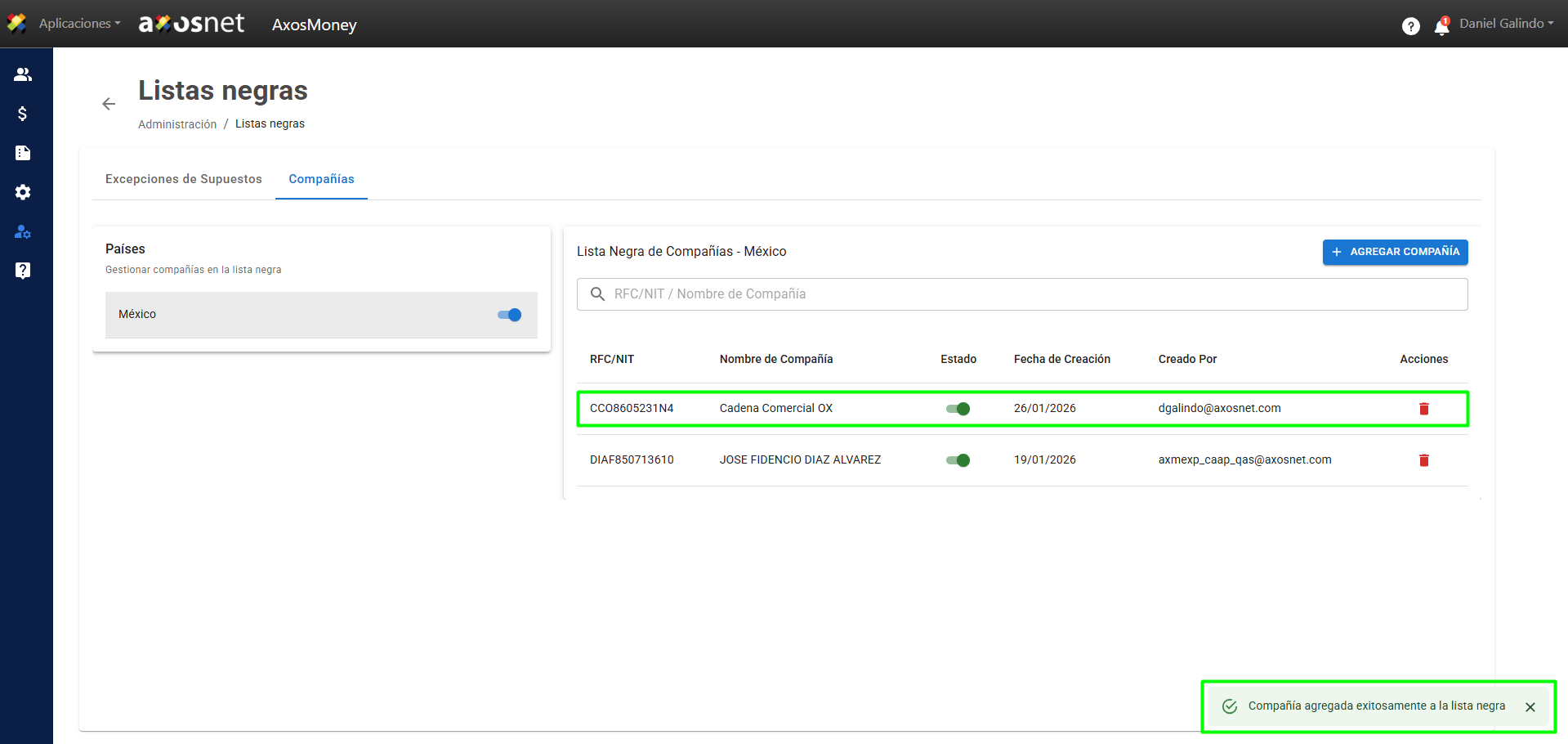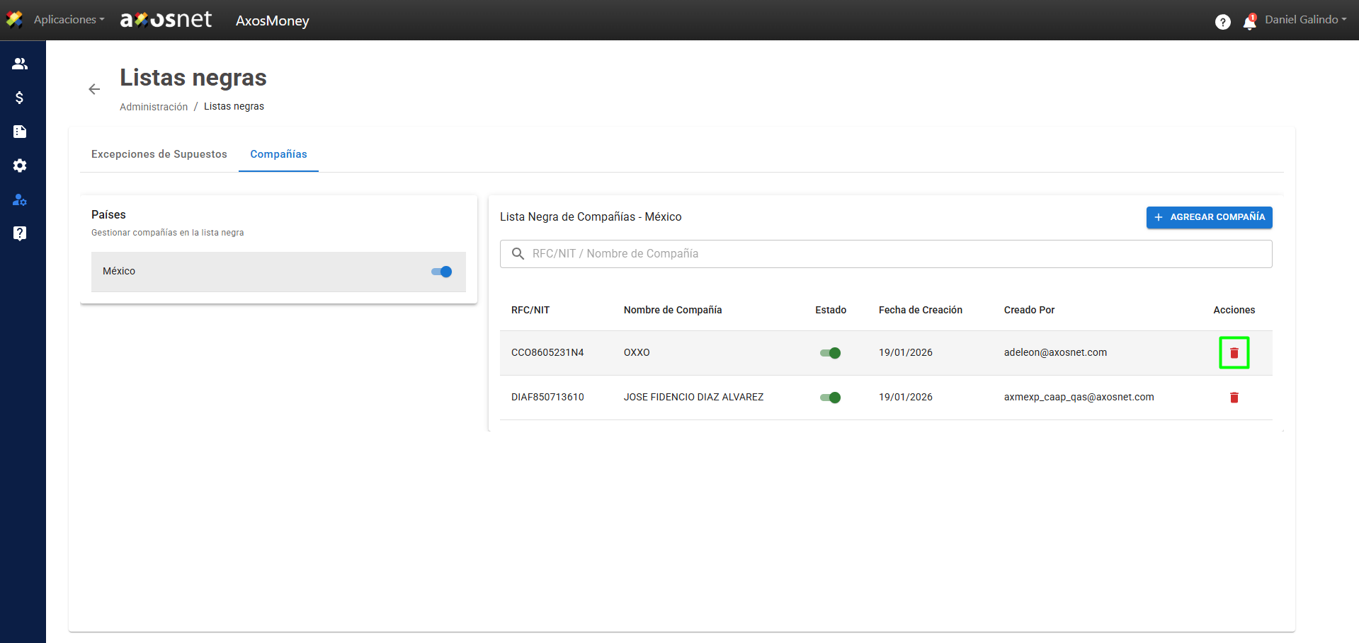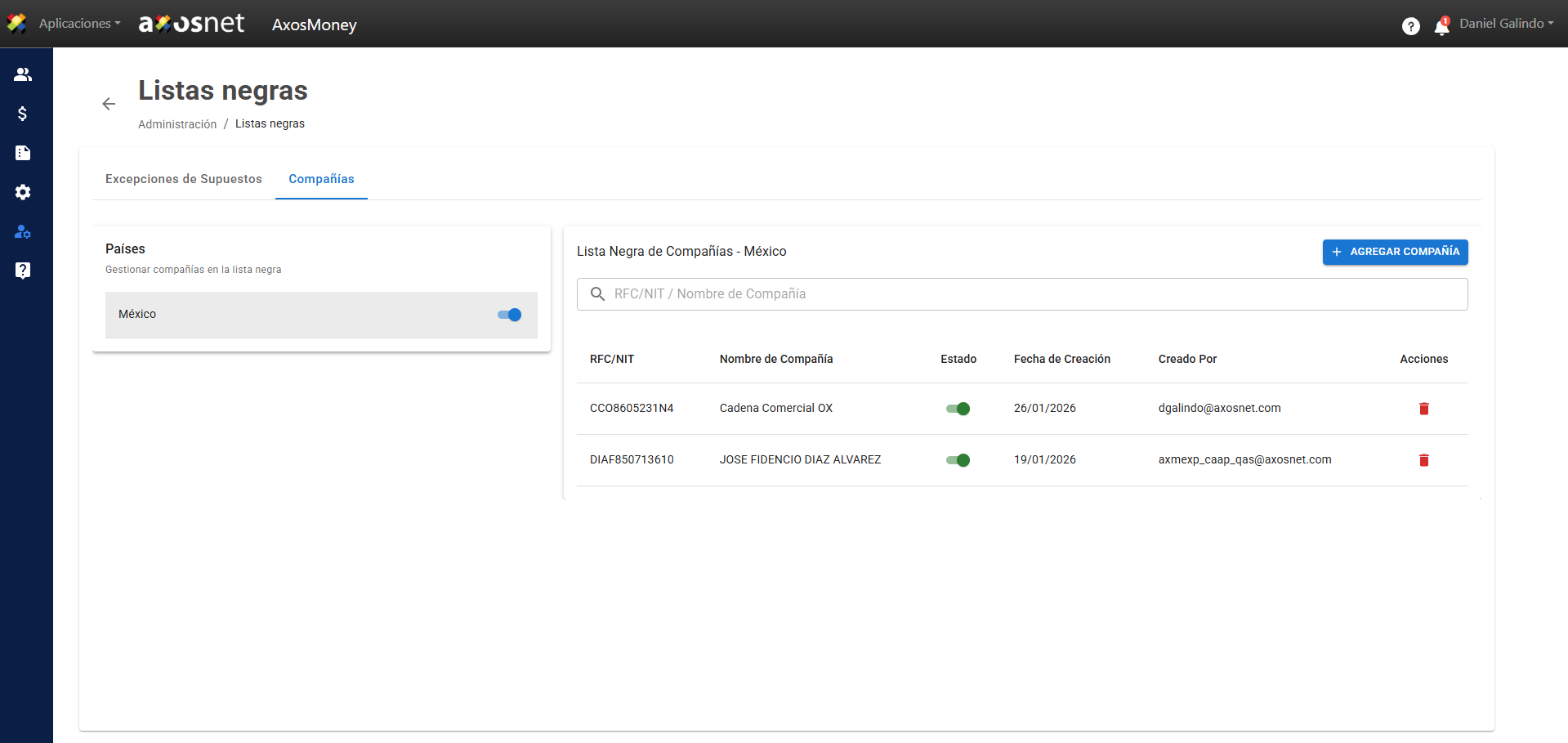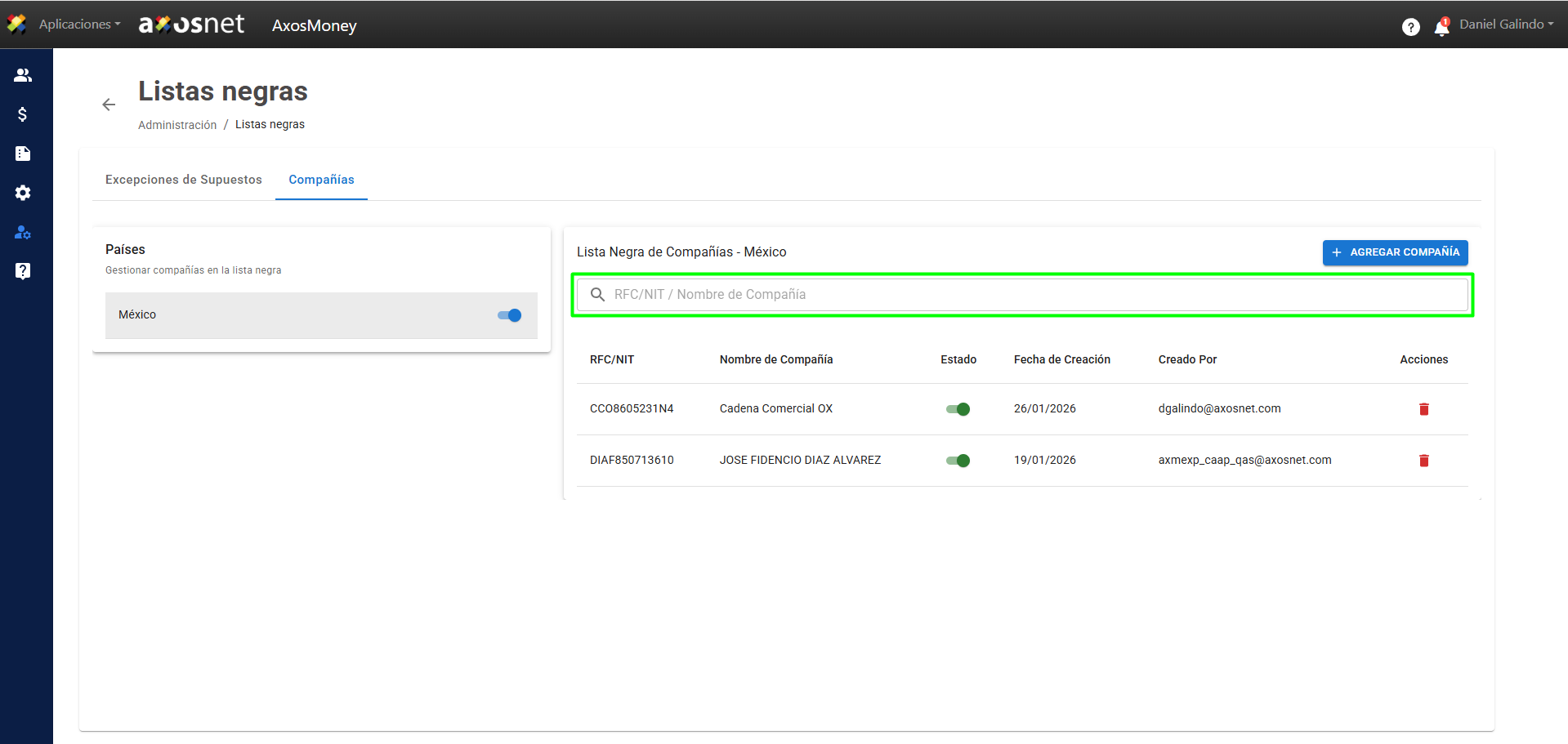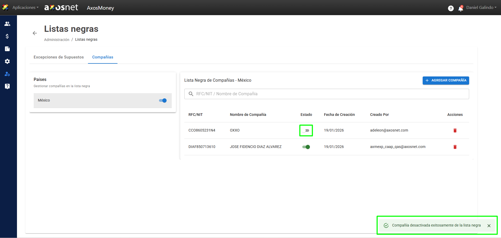 Esta funcionalidad de AxosMoney permite a los administradores de la aplicación gestionar una lista de compañías bloqueadas y definir si sus facturas deben ingresar al sistema. Los administradores pueden controlar su estado individualmente: cuando una compañía está activa, sus facturas no se procesan; si está desactivada, se procesan normalmente. Esto brinda mayor control y visibilidad sobre el procesamiento de facturas en la plataforma.