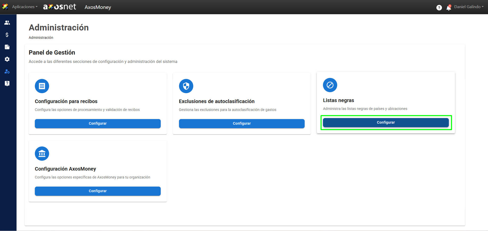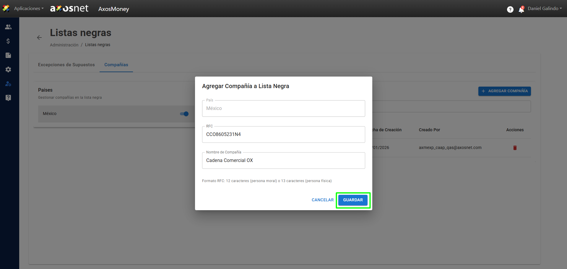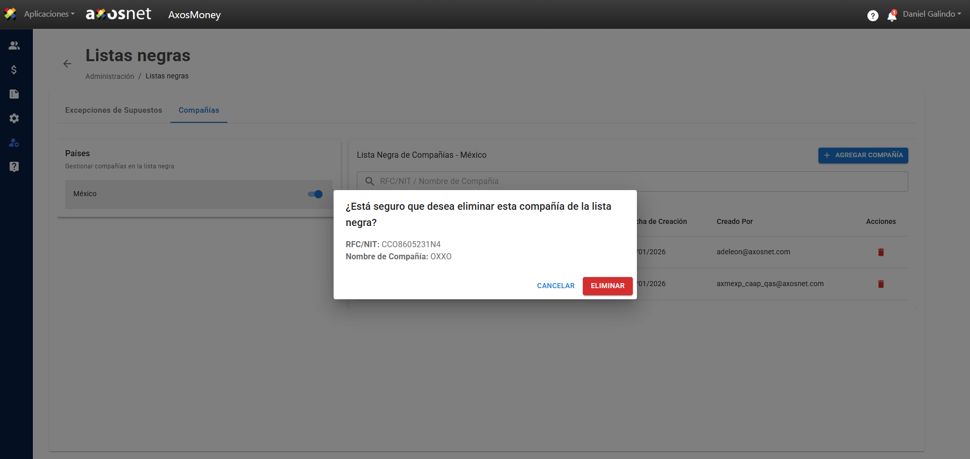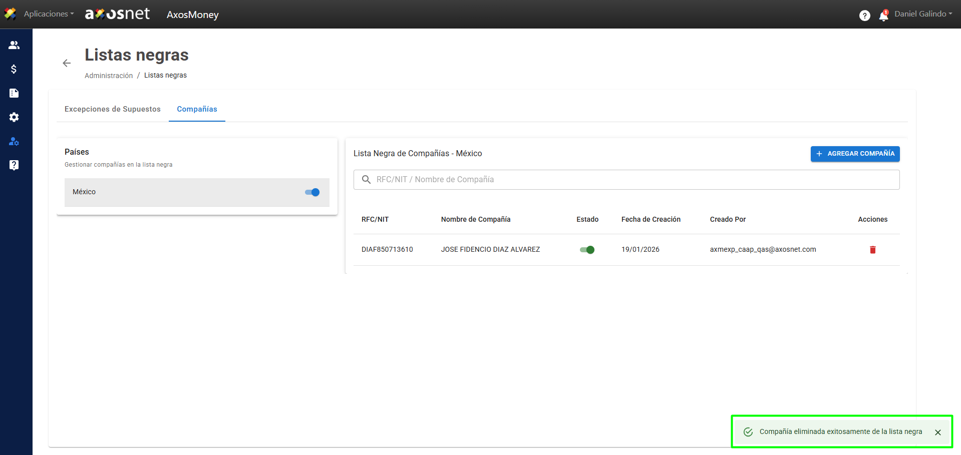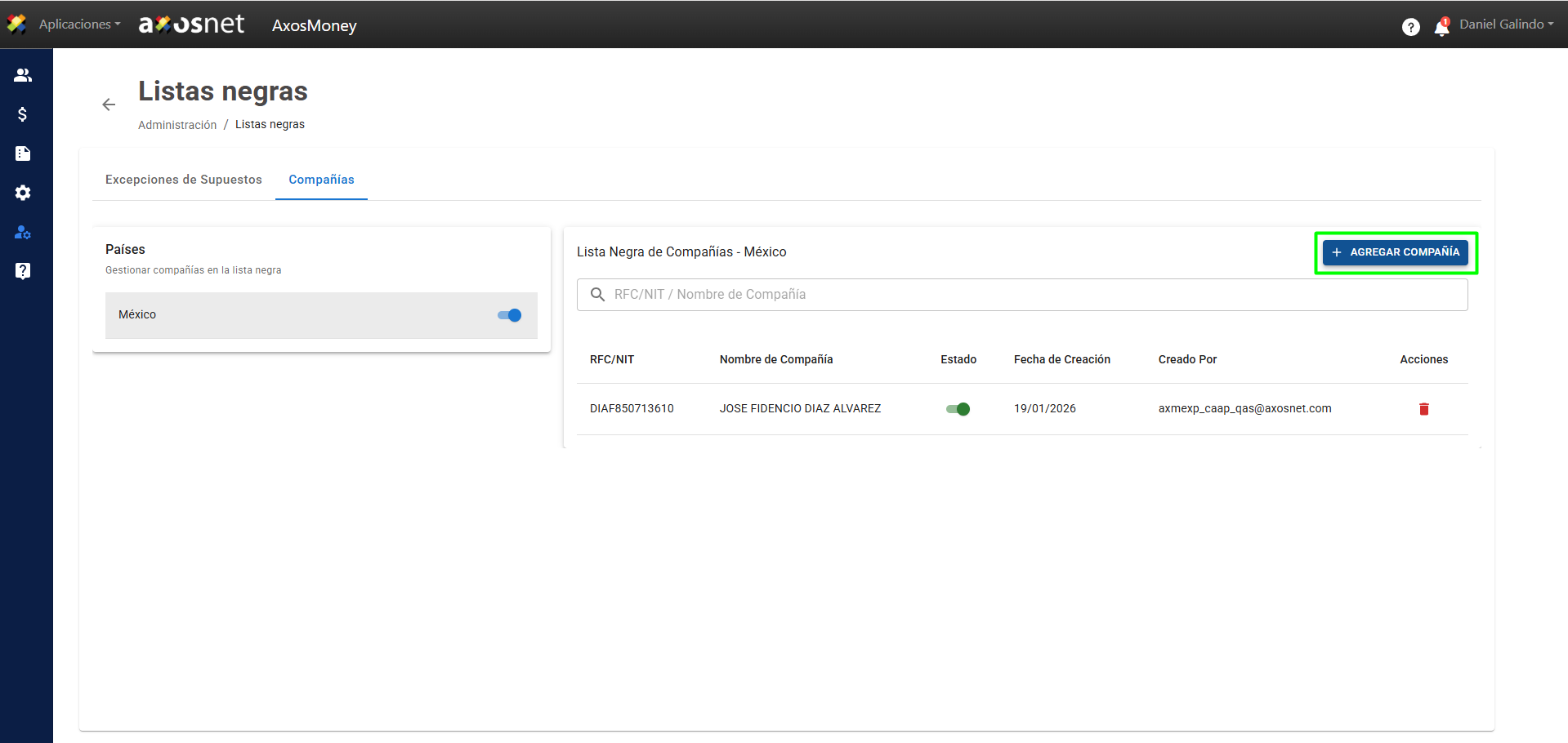 Esta funcionalidad de AxosMoney permite a los administradores de la aplicación gestionar una lista de compañías bloqueadas y definir si sus facturas deben ingresar al sistema. Los administradores pueden controlar su estado individualmente: cuando una compañía está activa, sus facturas no se procesan; si está desactivada, se procesan normalmente. Esto brinda mayor control y visibilidad sobre el procesamiento de facturas en la plataforma.