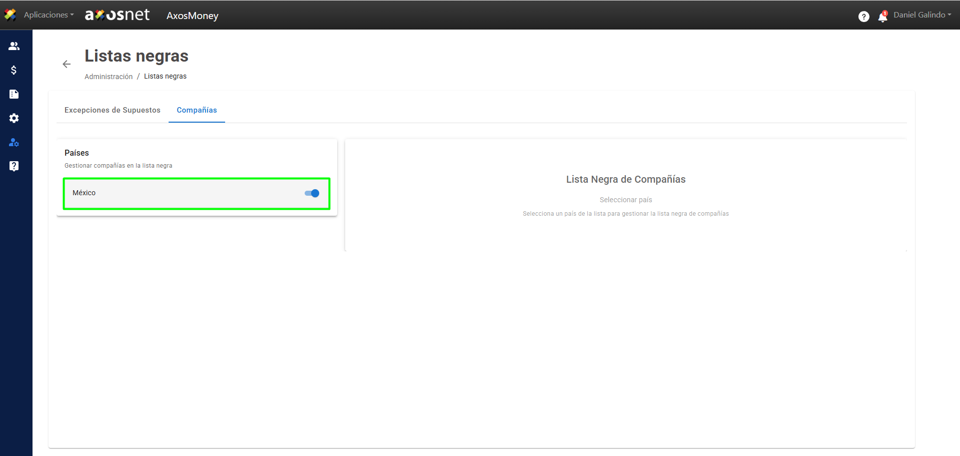 5. Seleccione el País en el que desea gestionar la Lista Negra de Compañías. Por el momento esta funcionalidad solo está habilitada para México.