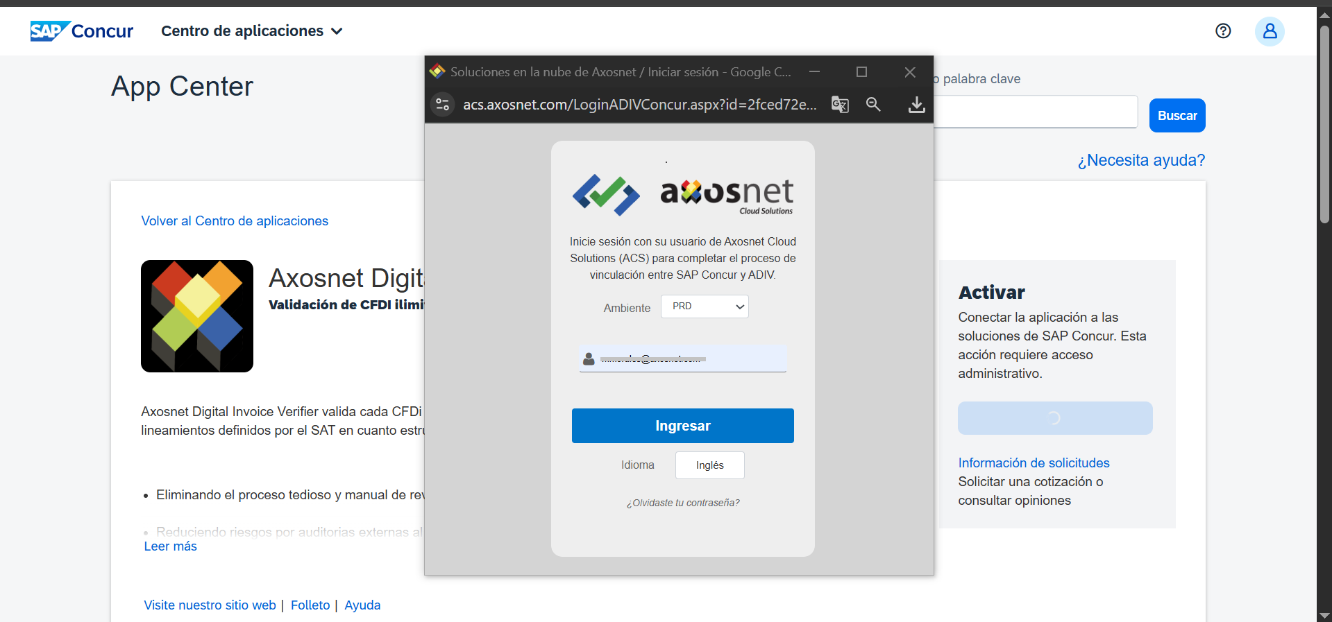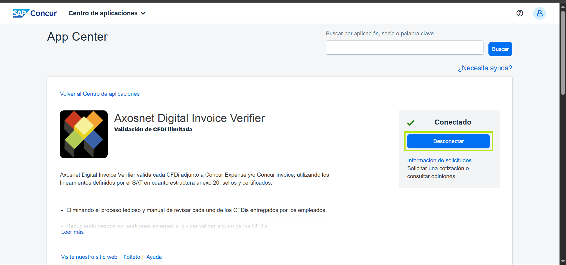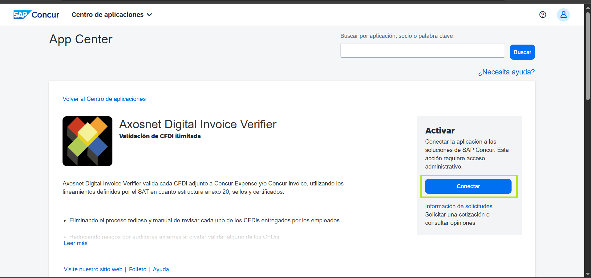 Quick Connect describe el proceso que usan los clientes para conectar su sitio de Concur con la aplicación de Axosnet; este proceso se establece al inicio cuando su compañía comienza a utilizar la App ADIV, y el Administrador de SAP Concur la crea. La conexión rápida permite que la función de ADIV valide los reportes.