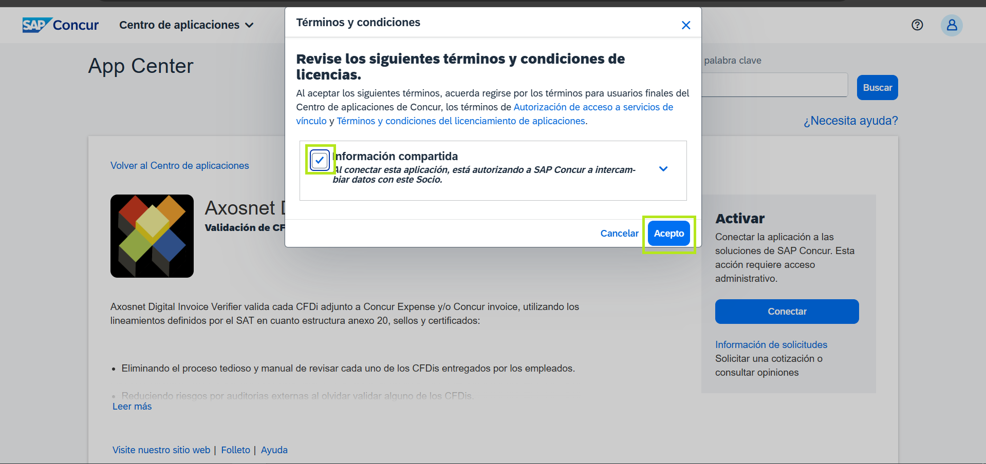 2. Aparecerá una ventana emergente de “Términos y Condiciones”, marque la casilla de verificación “Información compartida” y haga clic en el botón “Acepto”.