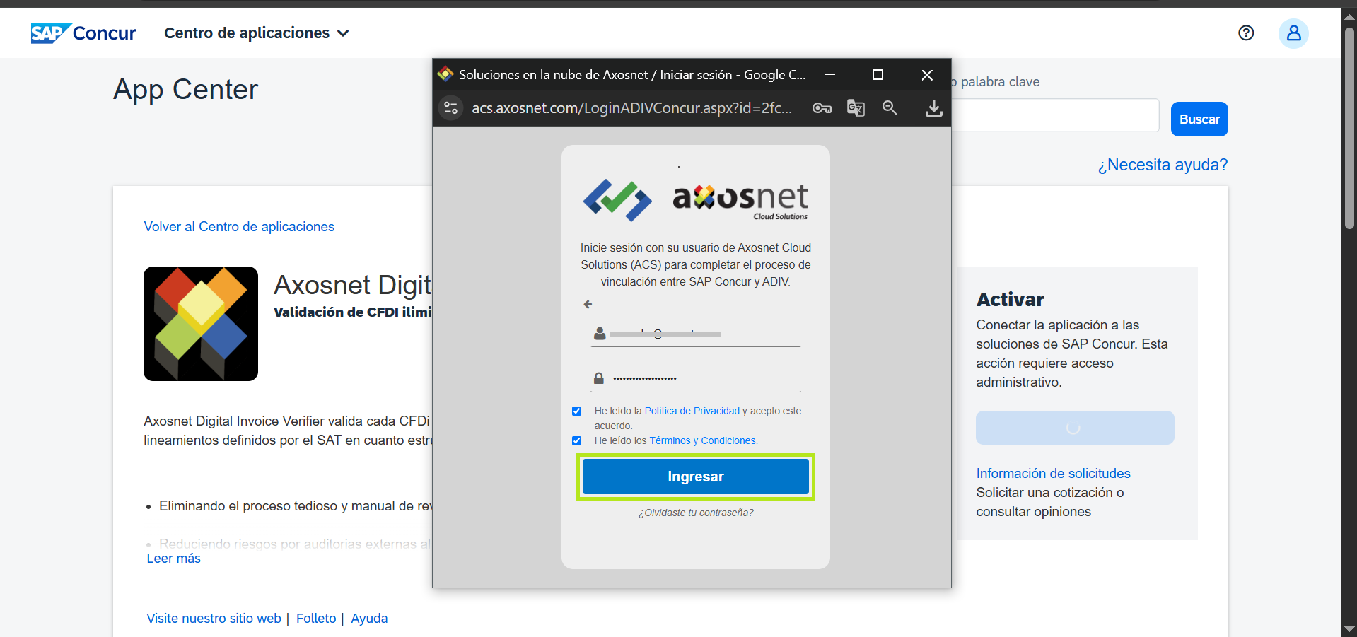4. La aplicación detectará que utiliza sus credenciales de ACS para iniciar sesión en la plataforma de ACS. Escriba sus credenciales de ACS y marque las casillas de verificación “Política de privacidad” y “Términos y condiciones”. Luego haga clic en el botón “Ingresar”.