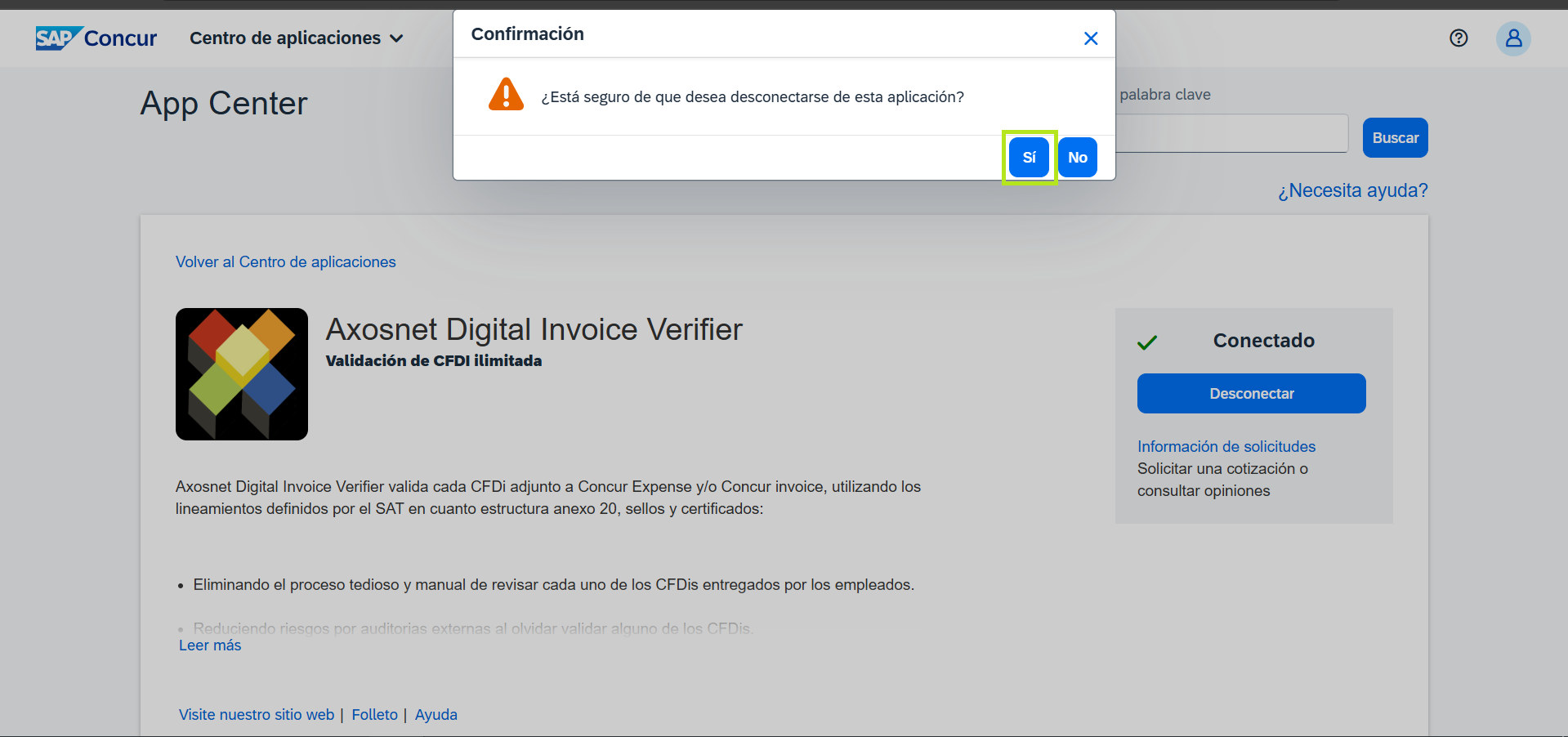 7. Aparecerá una ventana de confirmación que le preguntará si desea desconectarse de SAP Concur; haga clic en el botón “Sí” para continuar o “No” para cancelar la operación.