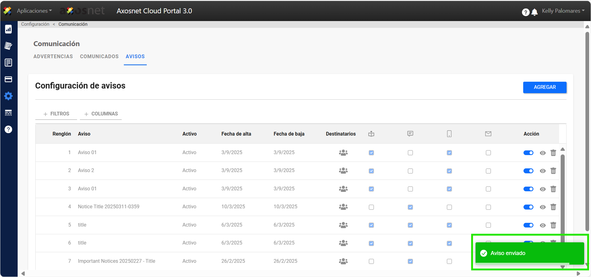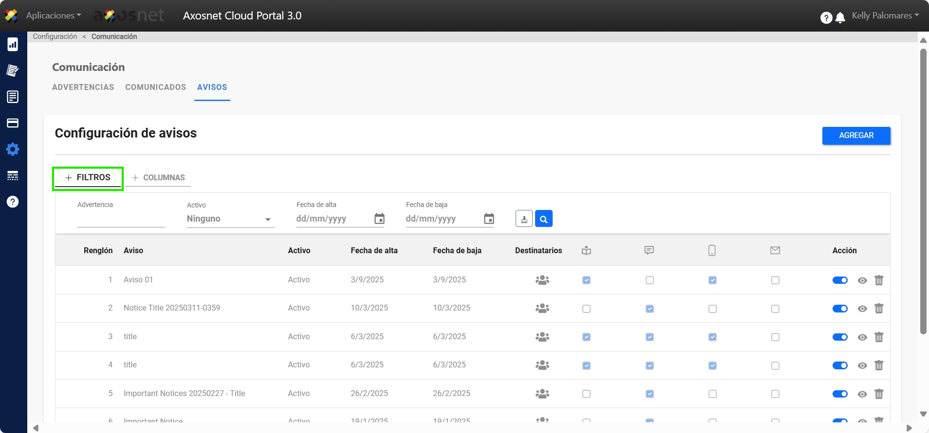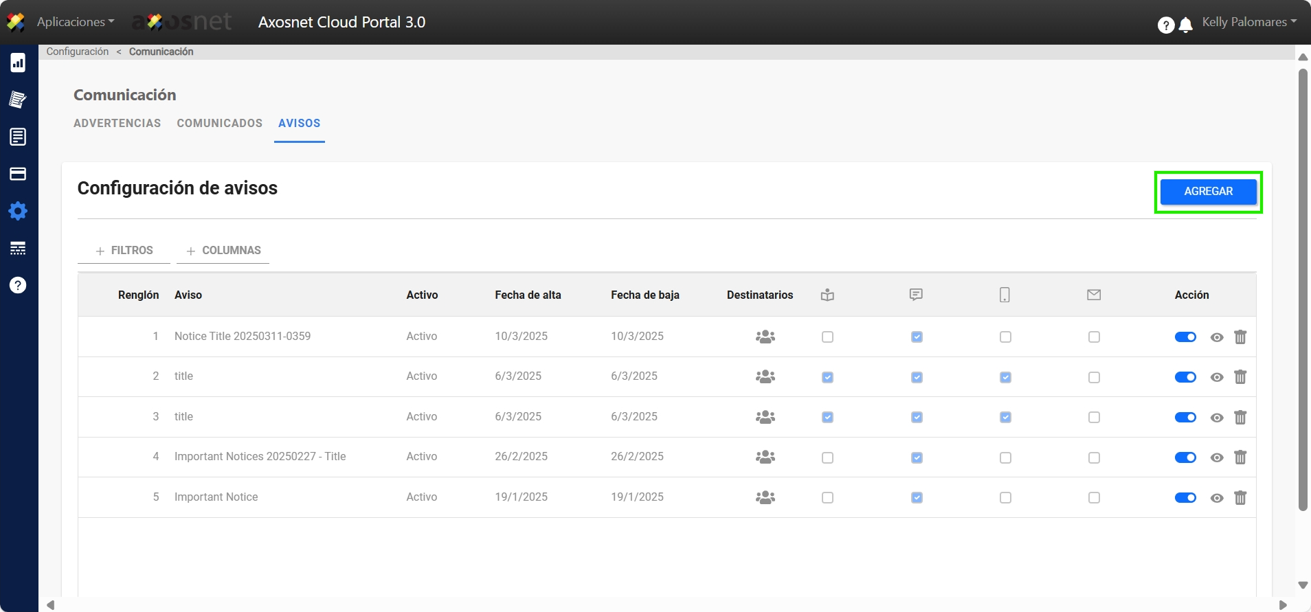 - Para agregar un nuevo aviso haga clic en AGREGAR.