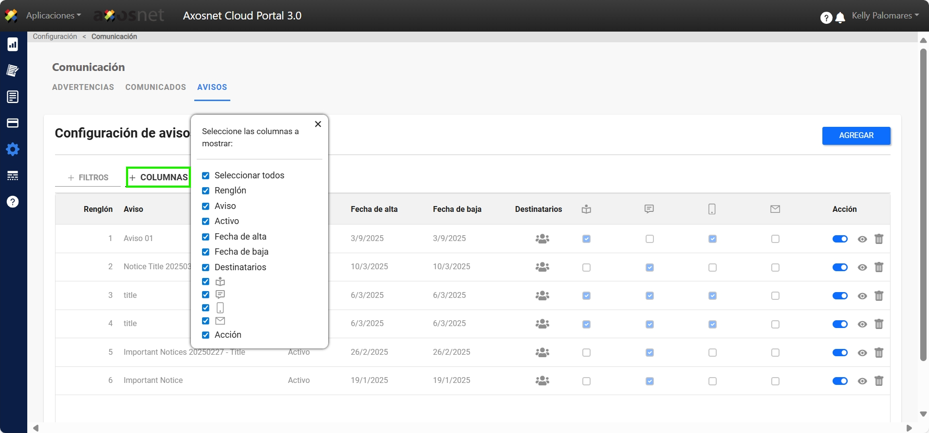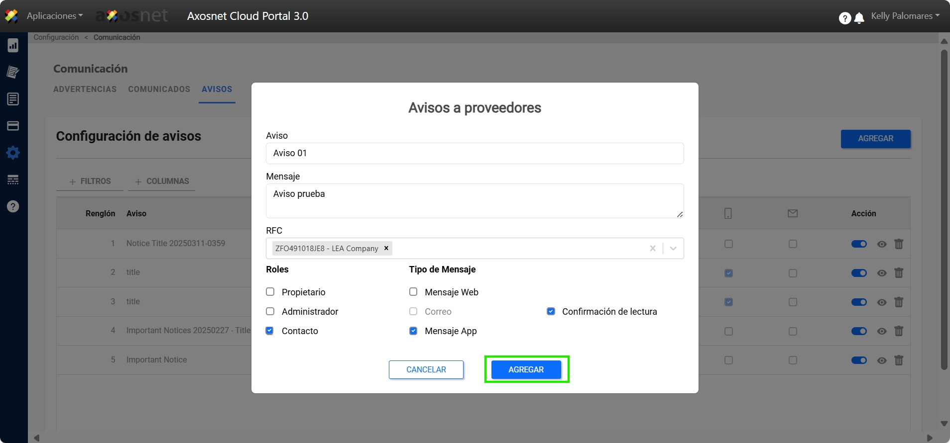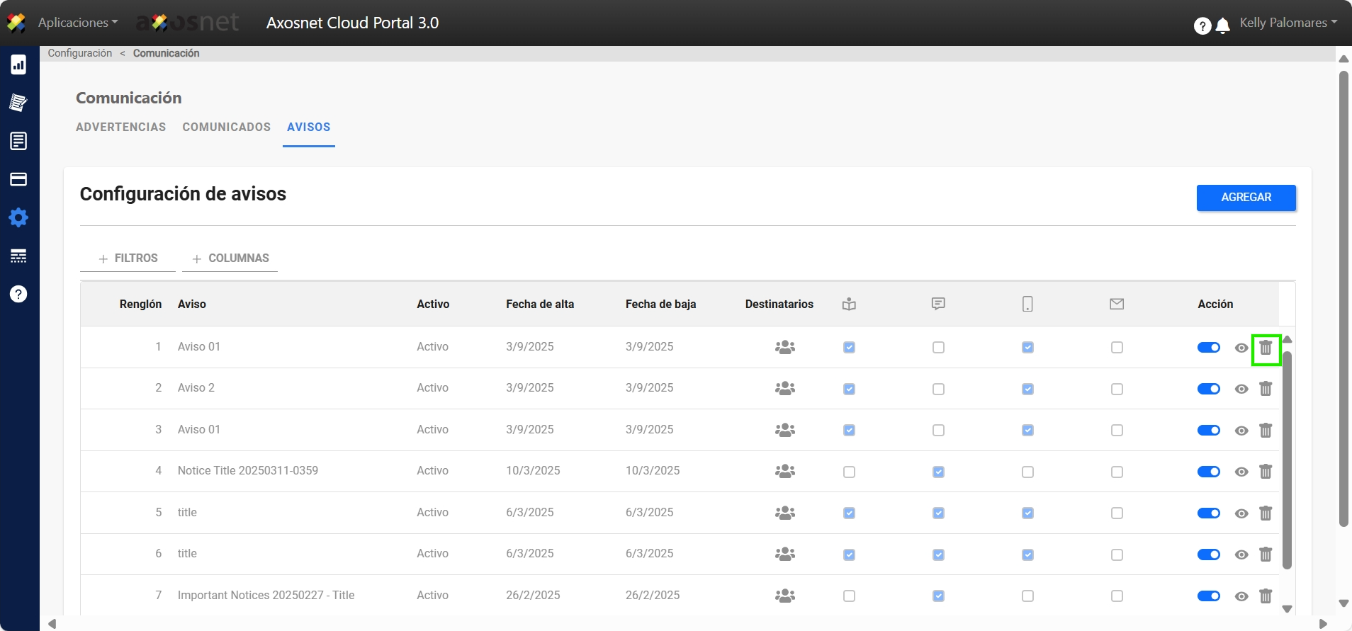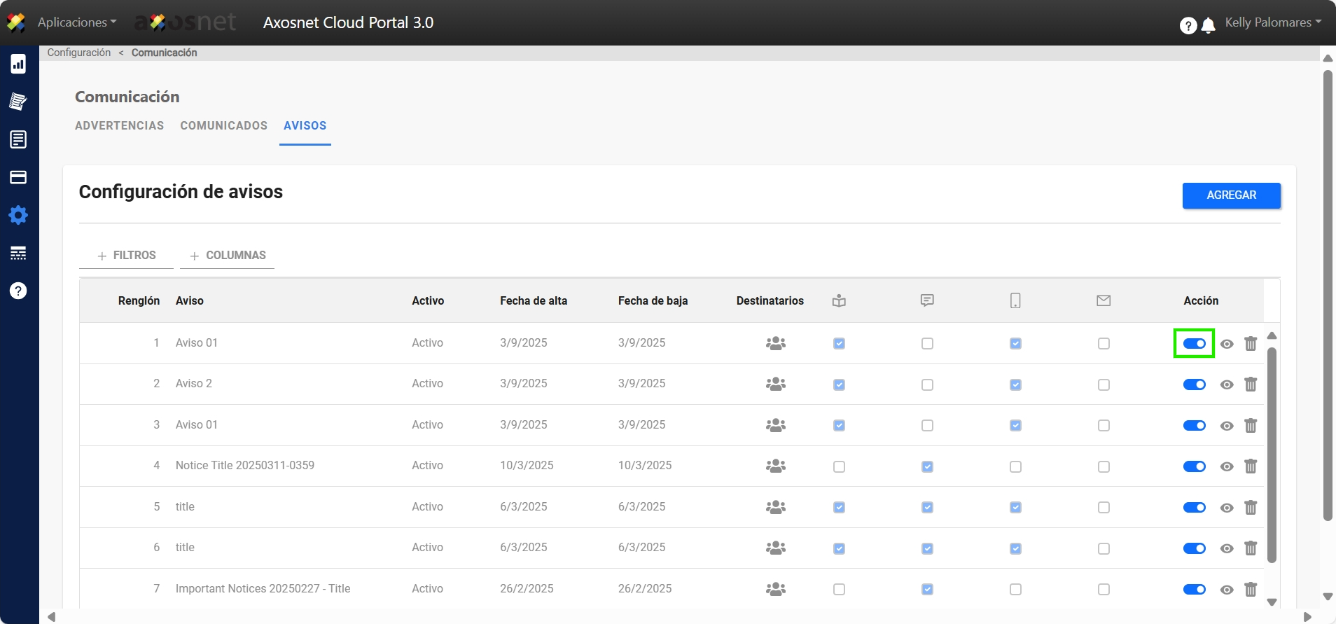 - Para agregar un nuevo aviso haga clic en AGREGAR.