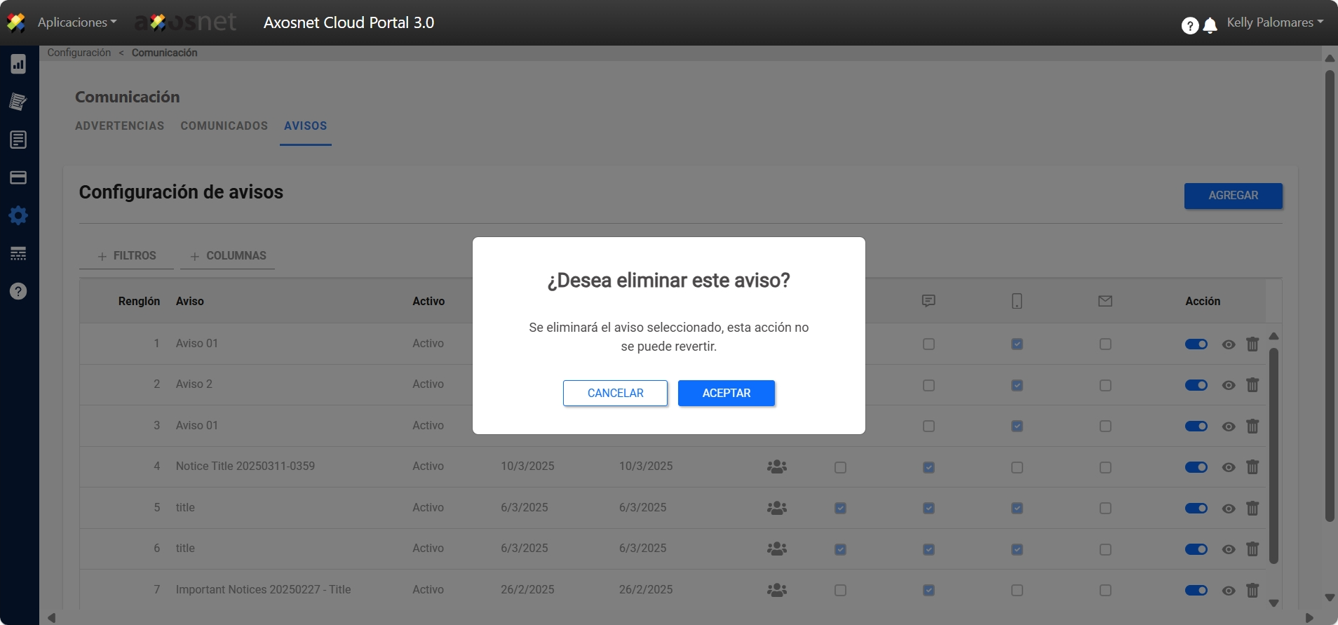 Para eliminar un aviso solo hacemos clic en el icono marcado en la imagen, aparecerá un mensaje para confirmar si queremos eliminar el comunicado, al aceptar el comunicado será eliminado.