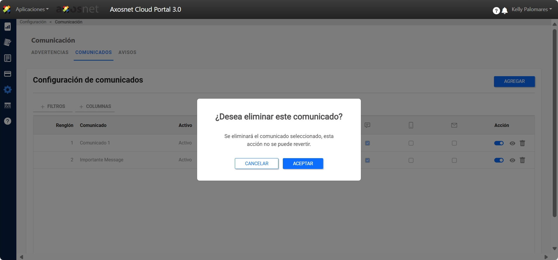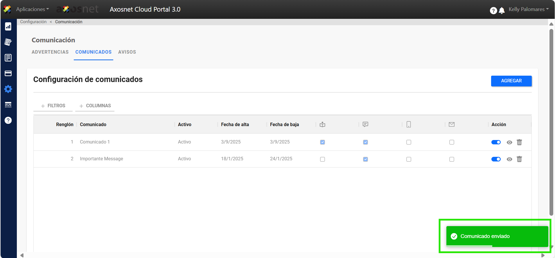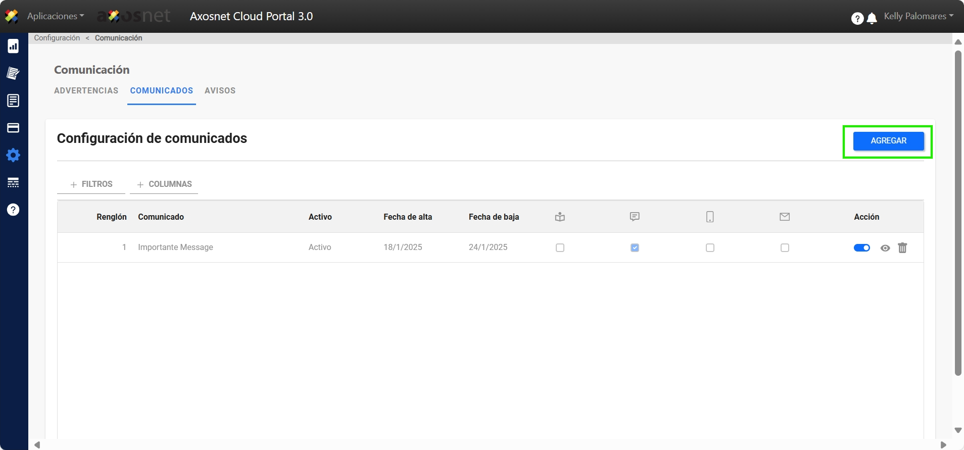 - Para agregar un nuevo comunicado haga clic en AGREGAR.
