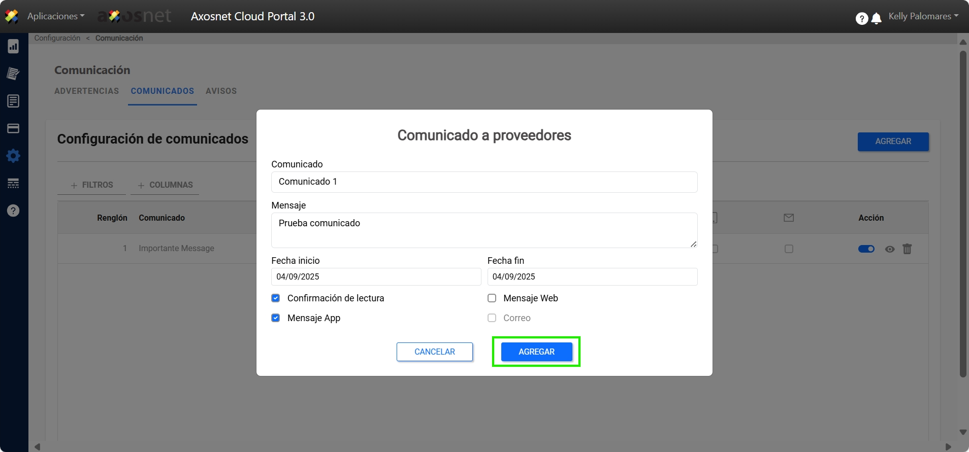 En este apartado se puede crear comunicados dirigidos a todos los proveedores del cliente, para esto es necesario darle click al botón de AGREGAR, aquí podrá ponerle un título, la descripción de su comunicados ,la fechas en que este comunicado estará activo, confirmaciones de lectura y el medio por el cual le llegará el comunicado.