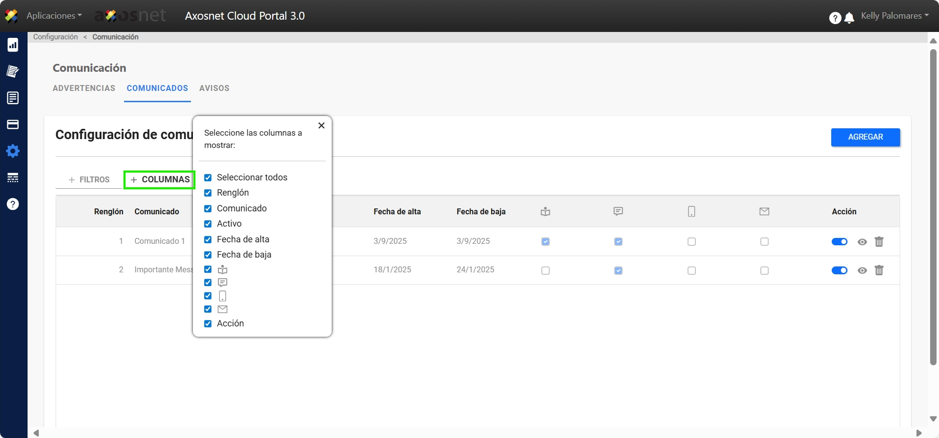 En la sección de Comunicados tendremos la opción de buscar por medio de los filtros o ocultar/mostrar las columnas necesarias.