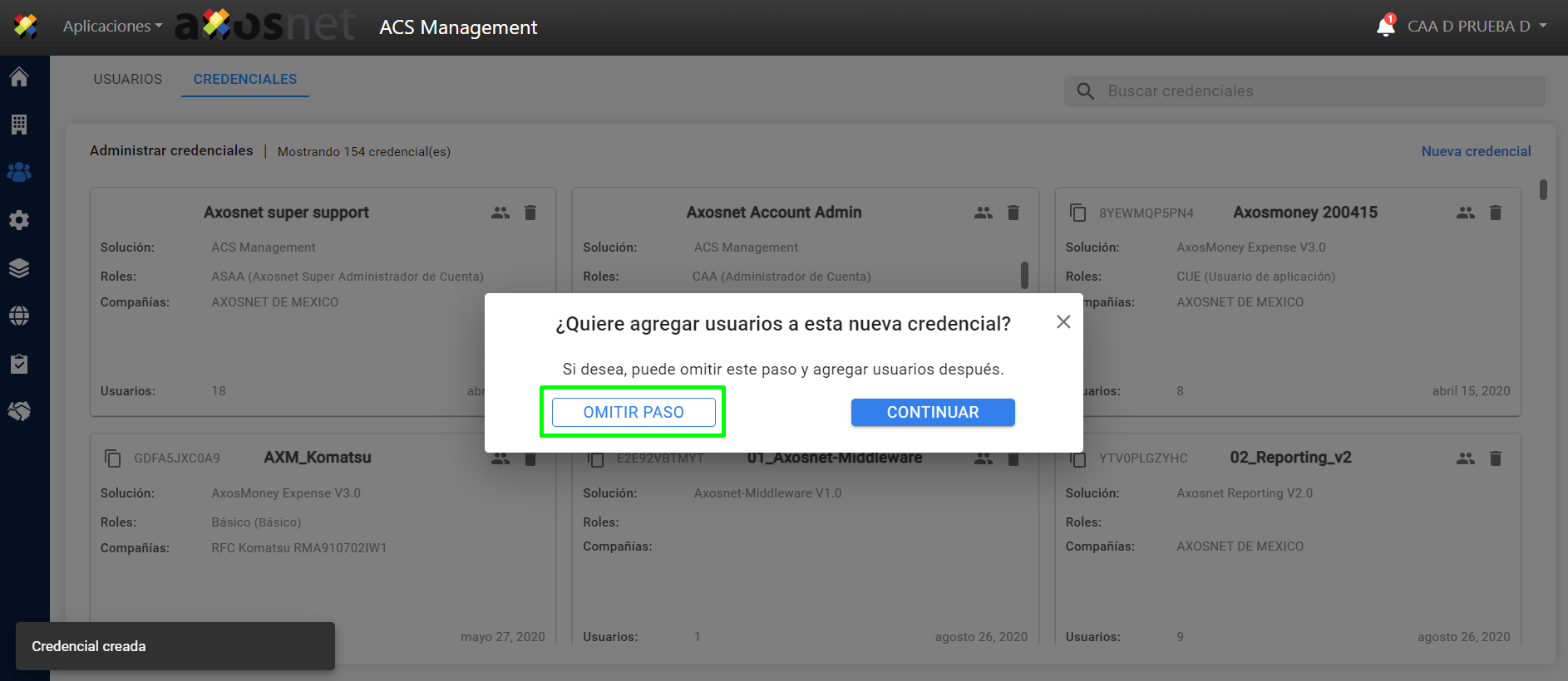 5. La credencial ha sido creada y aparecerá una ventana emergente preguntando si desea añadir usuarios a la nueva credencial, si desea hacerlo pulse “Continuar” o si lo prefiere puede saltarse este paso y hacerlo más tarde.