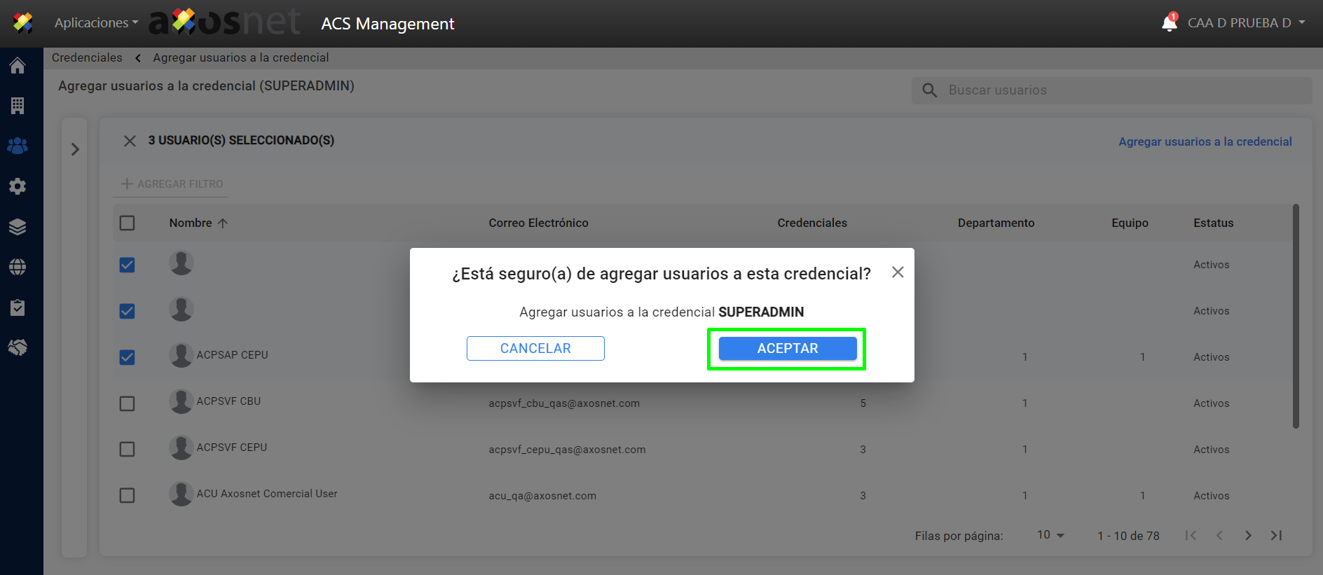 8. Aparecerá una ventana emergente para confirmar los usuarios que estamos añadiendo a la credencial. Haga clic en “Aceptar”.