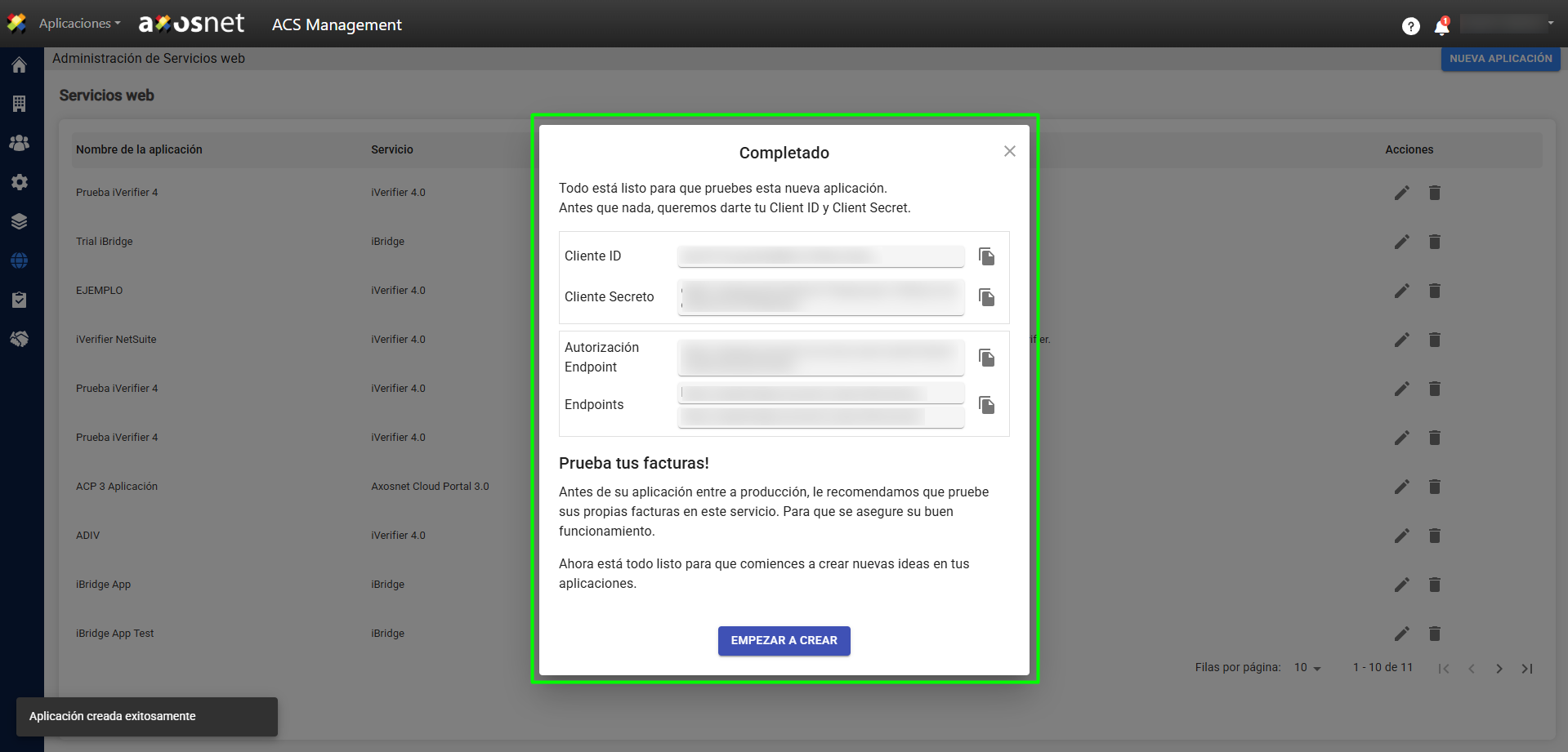 5. Aparecerá una nueva ventana emergente con los datos de Client ID y Client Secret para que pueda empezar a usar iBridge.