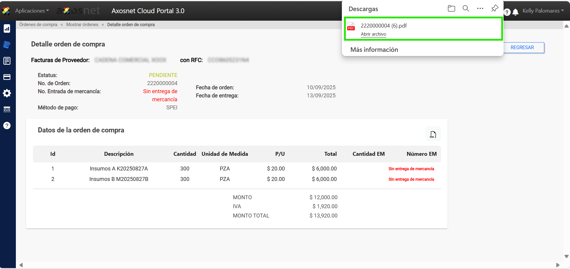 5. Al hacer clic aparecerá una pantalla que confirmará la descarga del archivo y al terminar podrá ver la Orden de Compra en sus descargas.