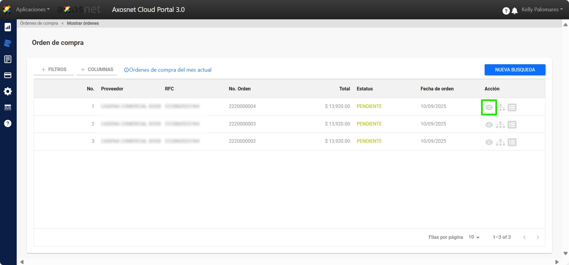 3. Aparecerá una pantalla con un listado de órdenes de compra, para descargar alguna haga clic en el icono del ojo  marcado en la imagen y lo llevará al detalle de la Orden de Compra.