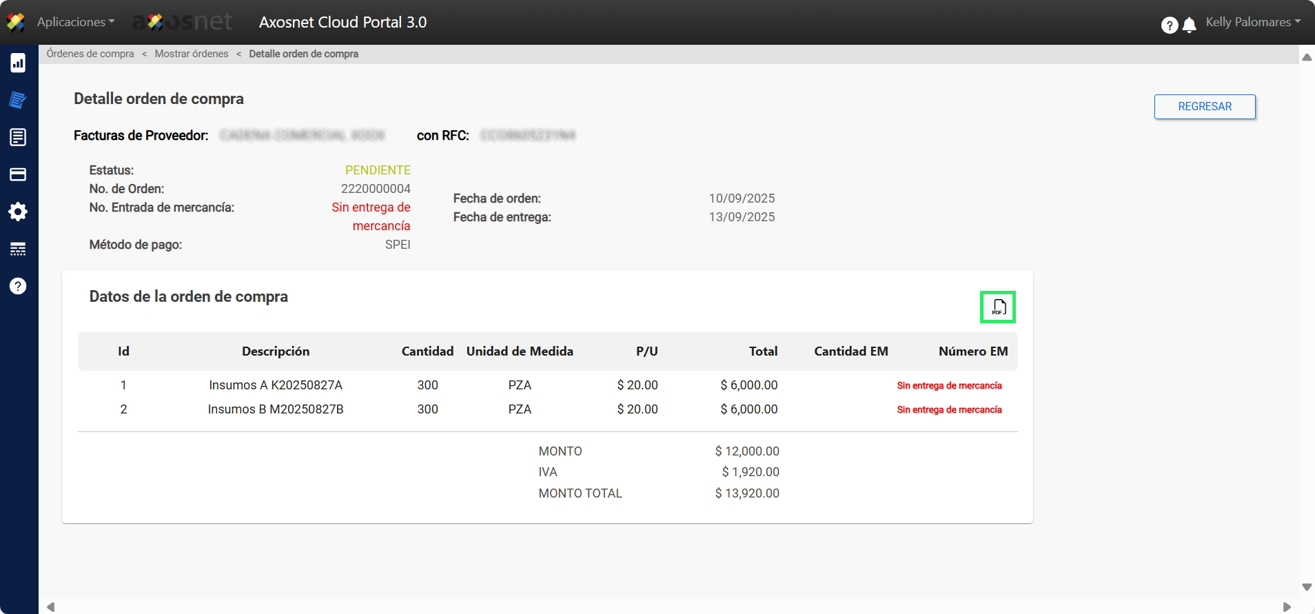 4. En esta pantalla podrá ver el detalle de la Orden de Compra y descargarla en formato PDF al hacer clic en el icono marcado en la imagen.