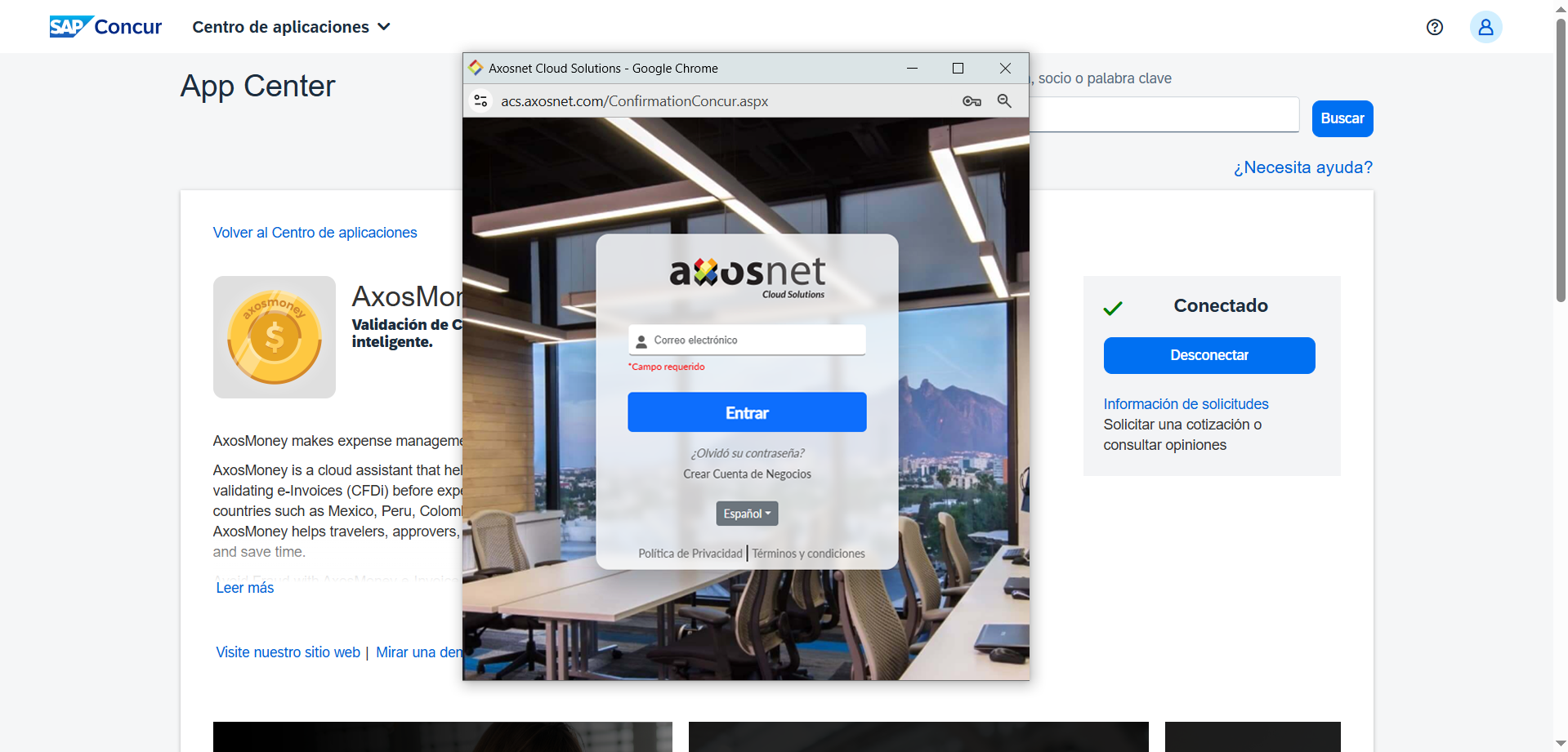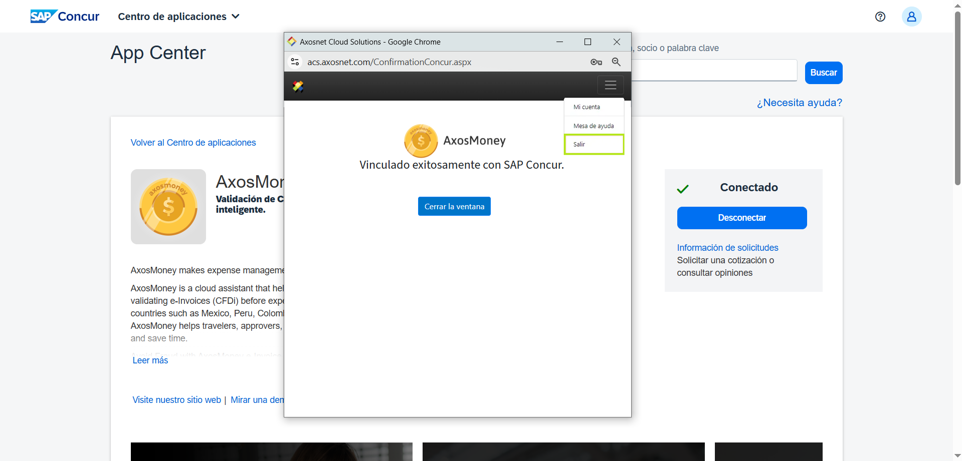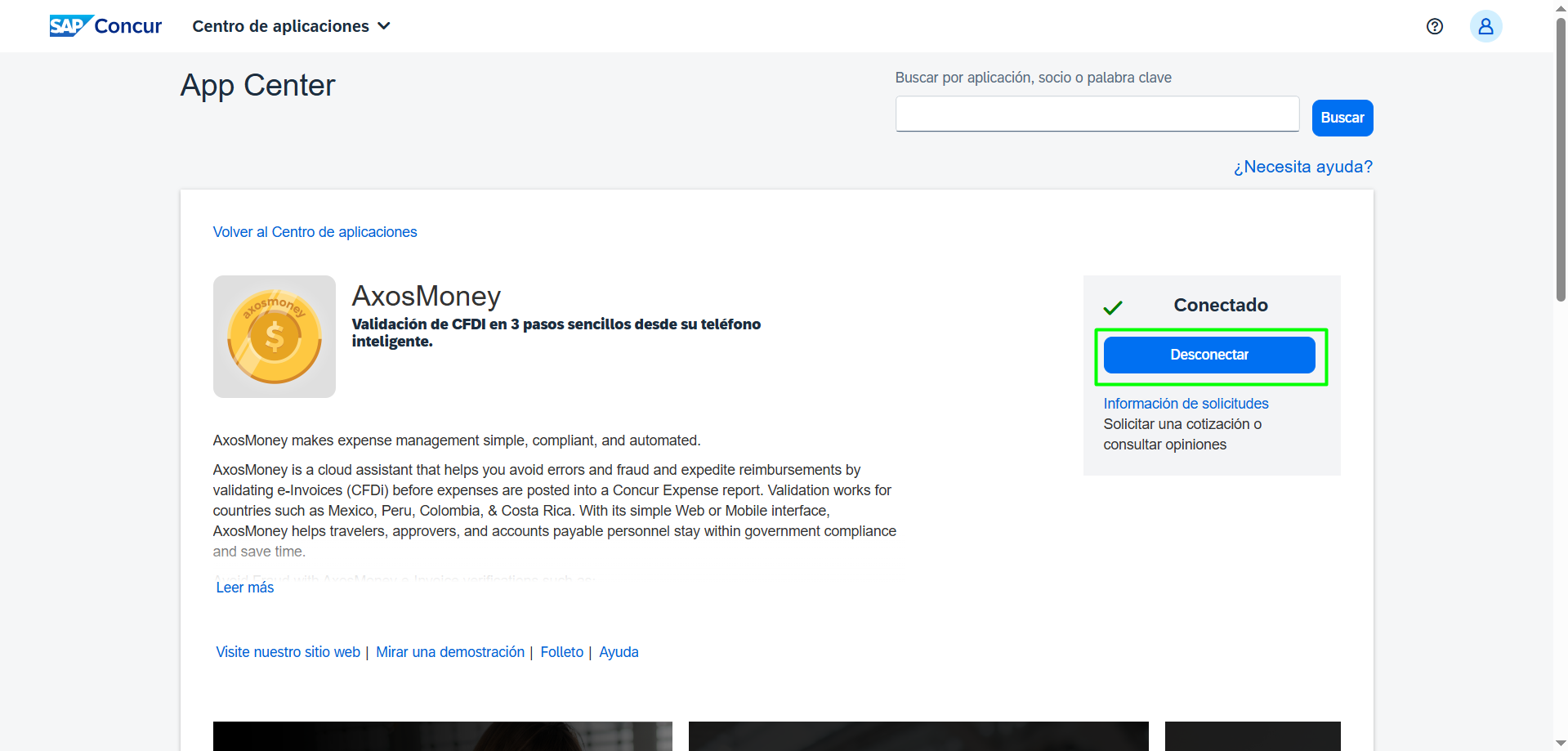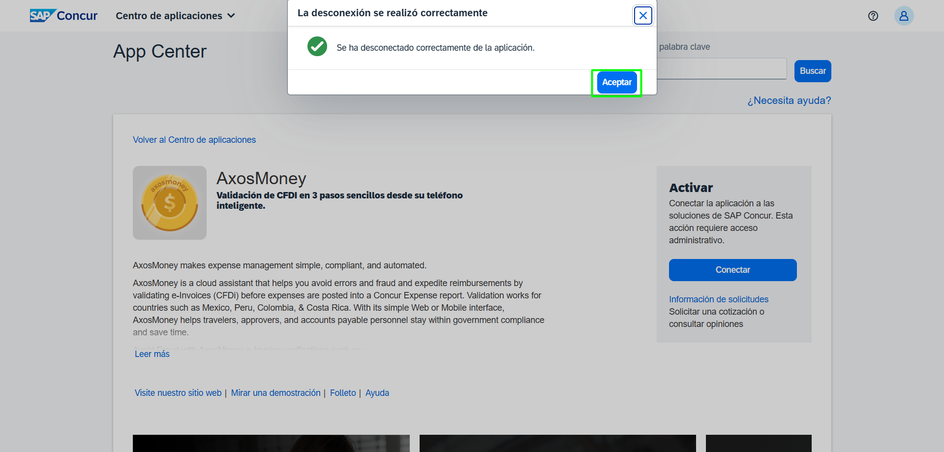 Este artículo describe el proceso que usan los clientes para desconectar su sitio de Concur con la aplicación de Axosnet; este proceso se establece al inicio cuando su empresa requiere desconectar la App AxosMoney y lo hace el Administrador de SAP Concur.