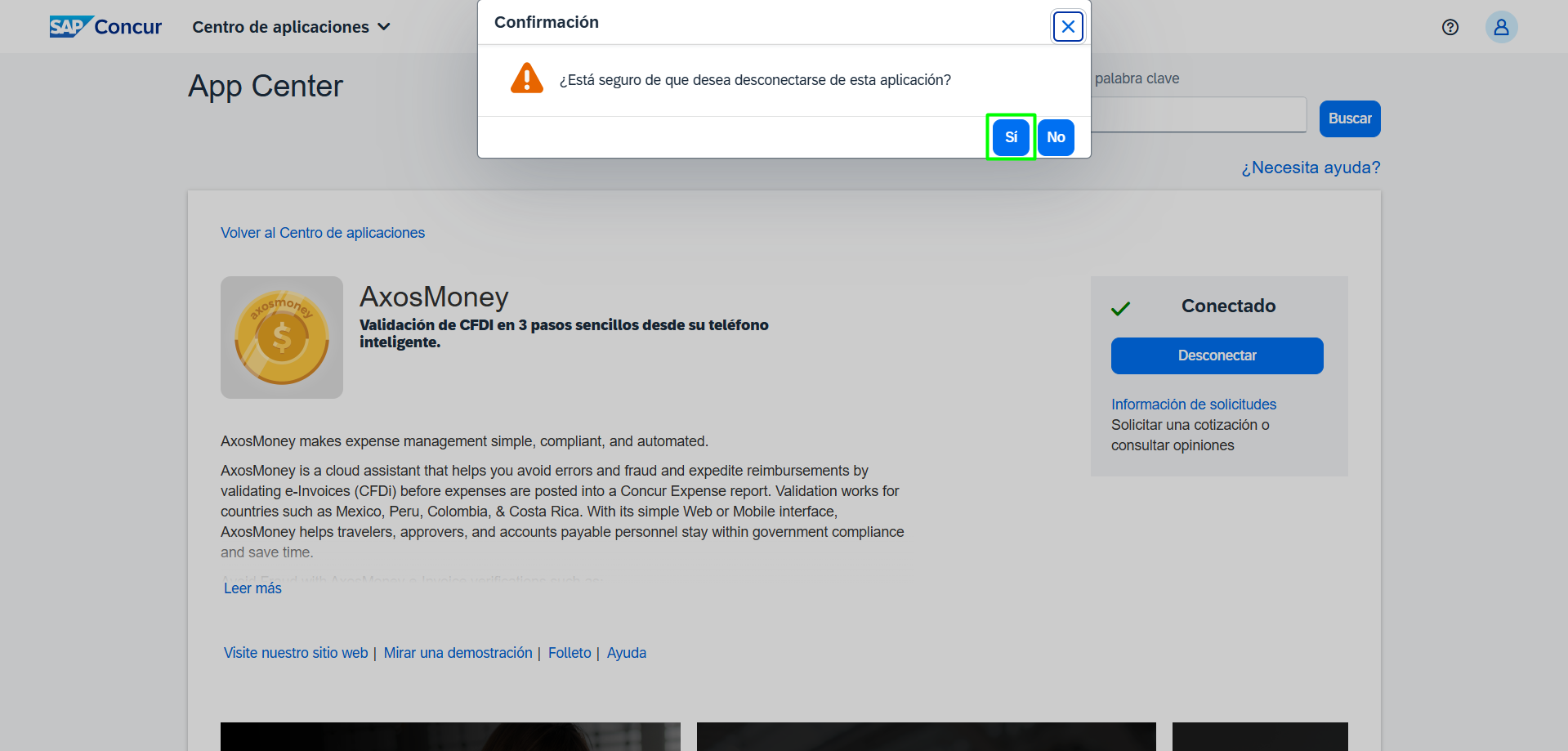 4. Aparecerá una alerta preguntándole si desea desconectarse de SAP Concur. Haga clic en el botón “Sí”. Ver que el botón no ha cambiado todavía.