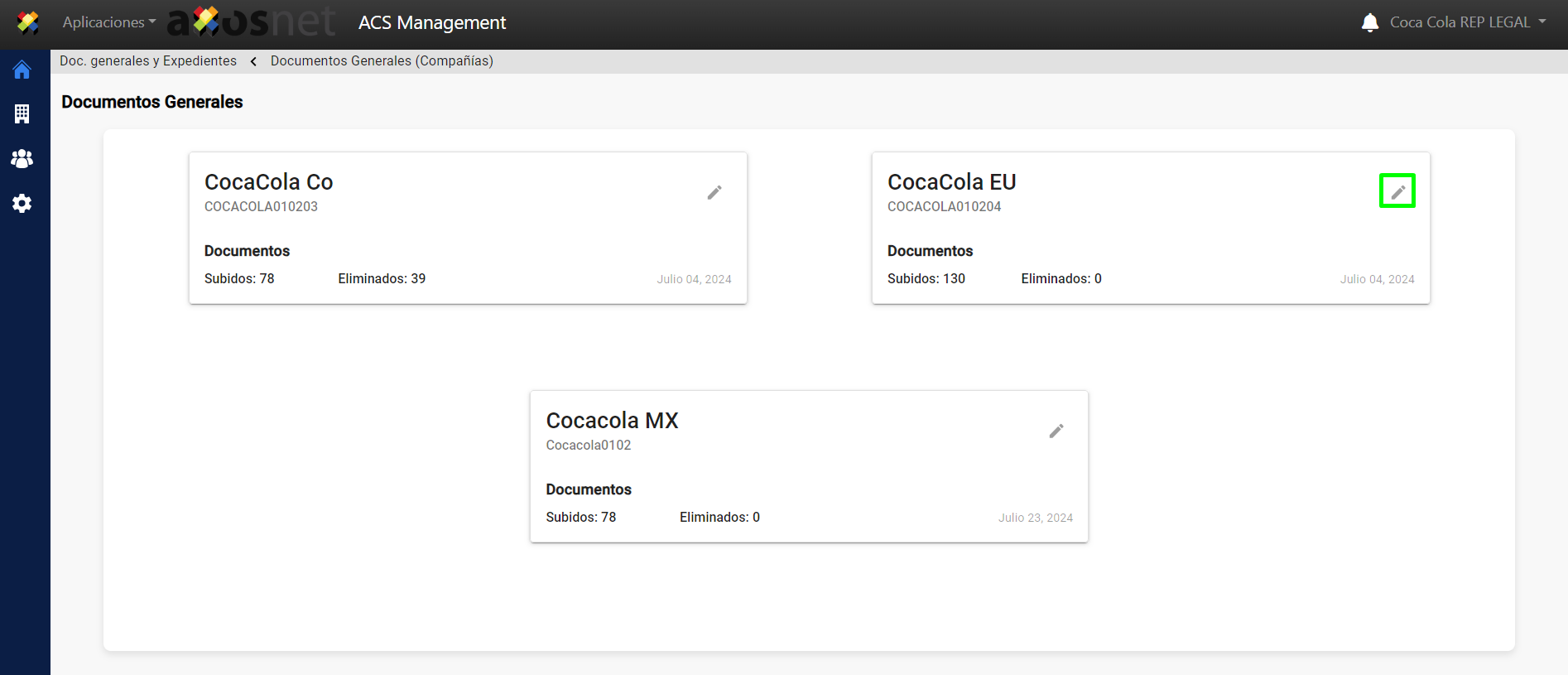 4. Seleccione la compañía donde se va a eliminar el documento y clic en el ícono “editar”.