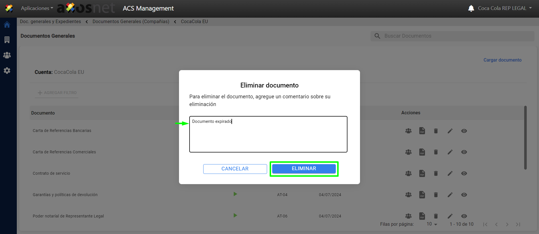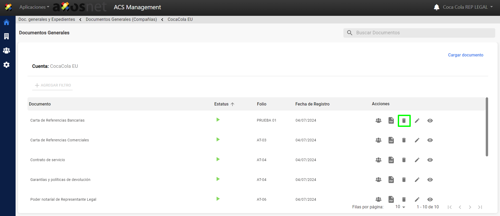 5. Seleccione el documento a eliminar y haga clic en el icono de “eliminar”.