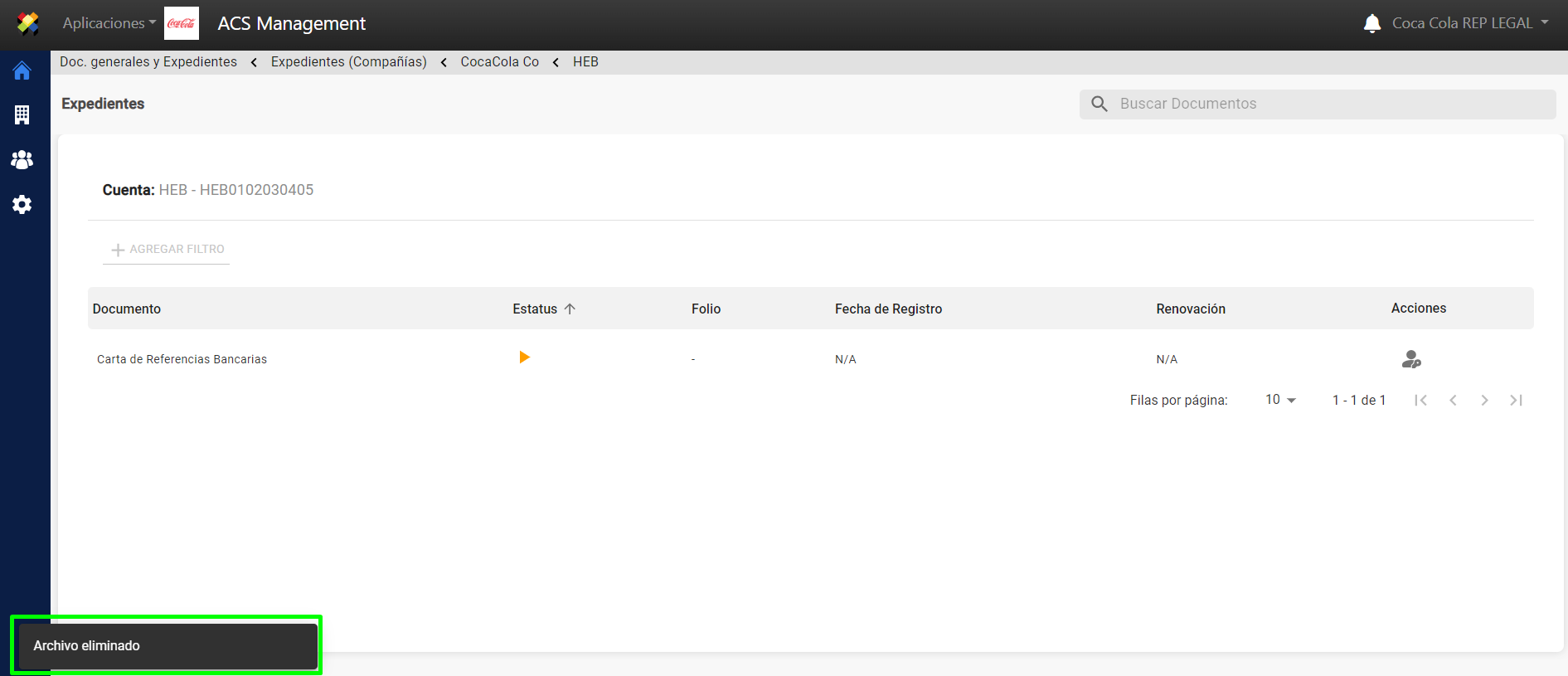 7. Se muestra notificación del archivo eliminado.