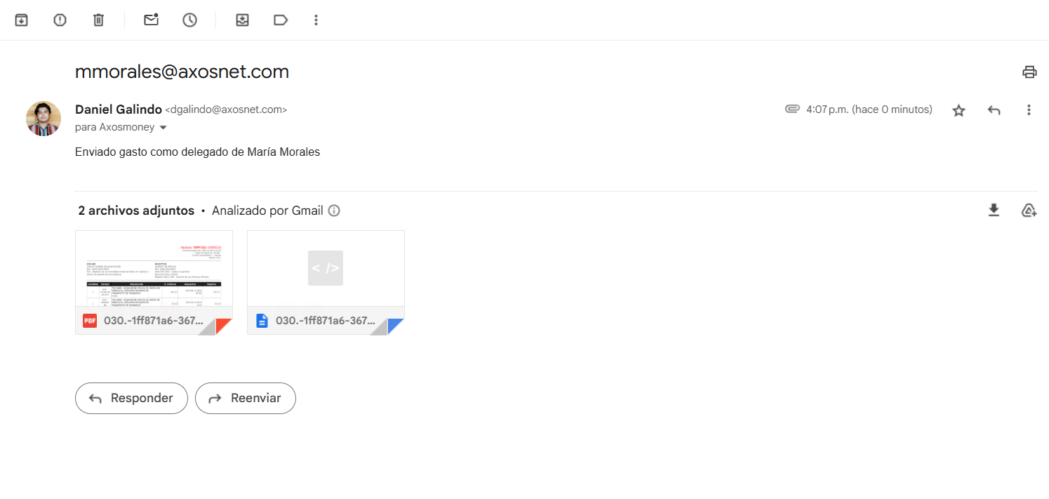 Esta sección cubre el proceso en el que un usuario de AxosMoney envía sus facturas a validación por correo electrónico actuando como delegado de otro usuario.