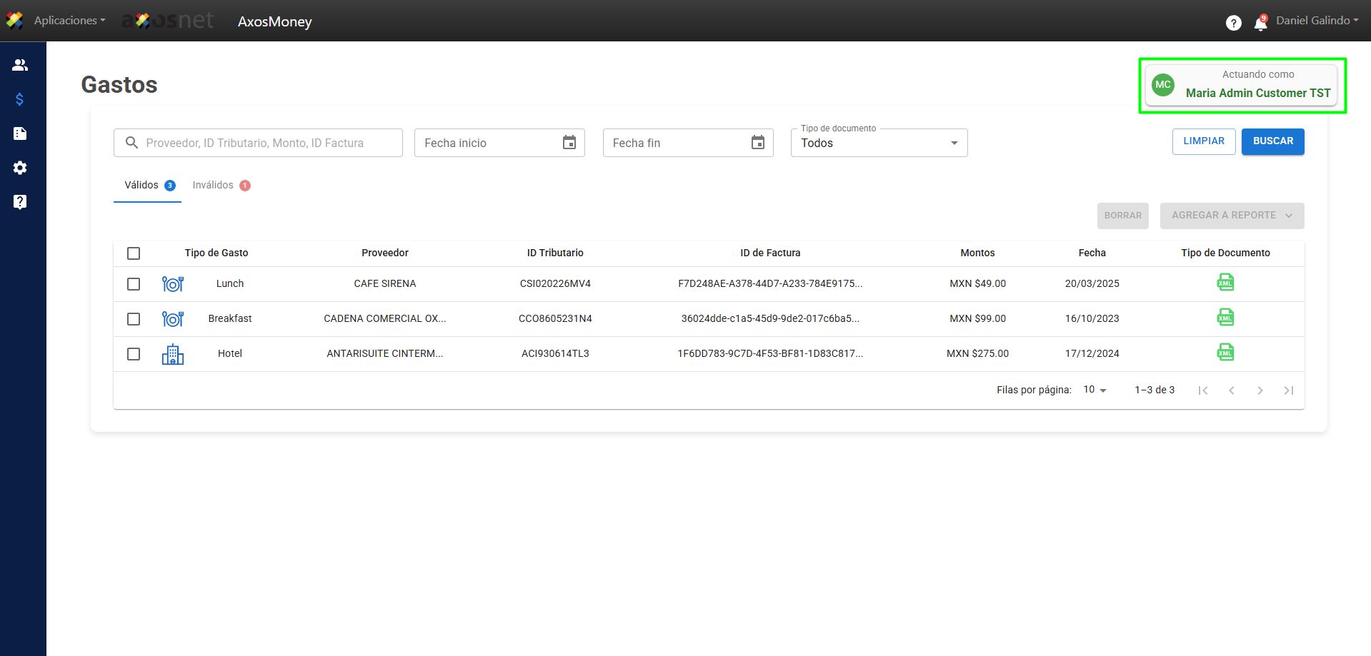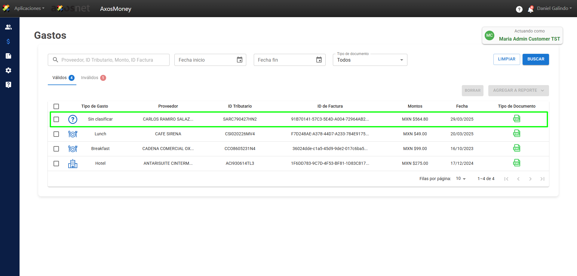 3. Al “Actuar como” otro usuario podrá ver sus facturas válidas e inválidas, así como clasificarlas y generar reportes. Aparecerá en un recuadro en la parte superior derecha indicando el usuario al que está representando (“Actuando como”).