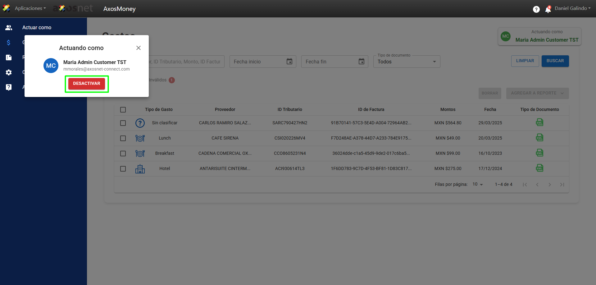 2. Al acceder a AxosMoney, seleccione la opción “Actuar como” y el usuario al que representa en el menú lateral izquierdo.
