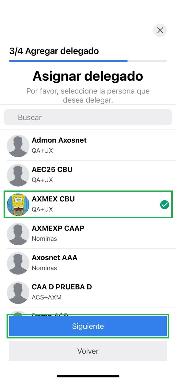4. Se mostrará la lista de los colaboradores disponibles que puede asignar como delegado, Seleccione al colaborador y haga clic sobre “Siguiente”.