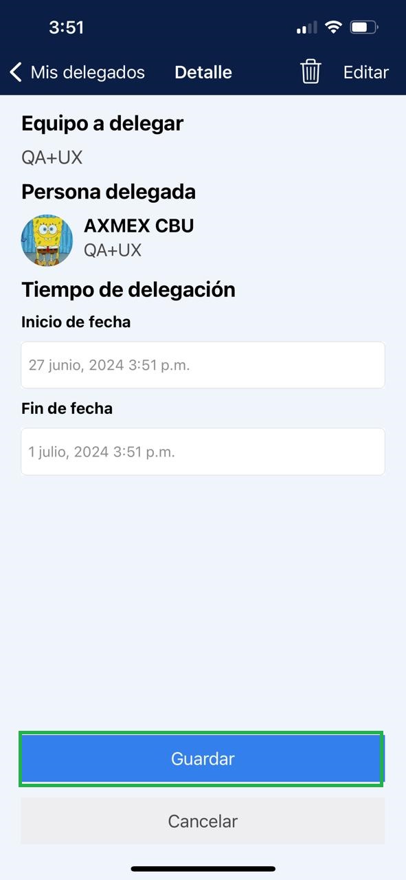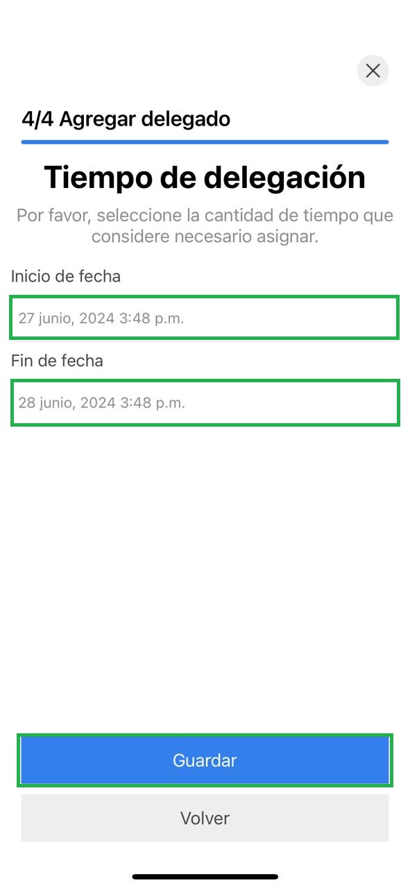 5. Indique el tiempo que el usuario asignado tendrá habilitado para delegar al equipo. Después haga clic sobre “Guardar”.