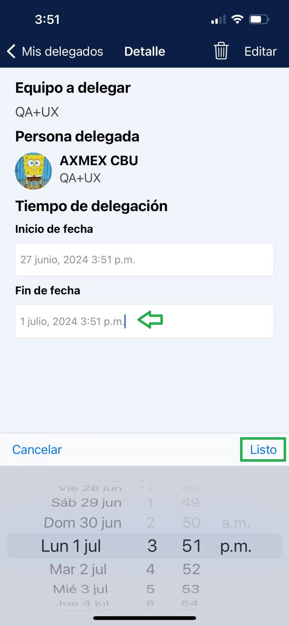 Se podrá modificar el tiempo de delegación de un colaborador, ya sea reducir o ampliar el periodo anteriormente asignado.
