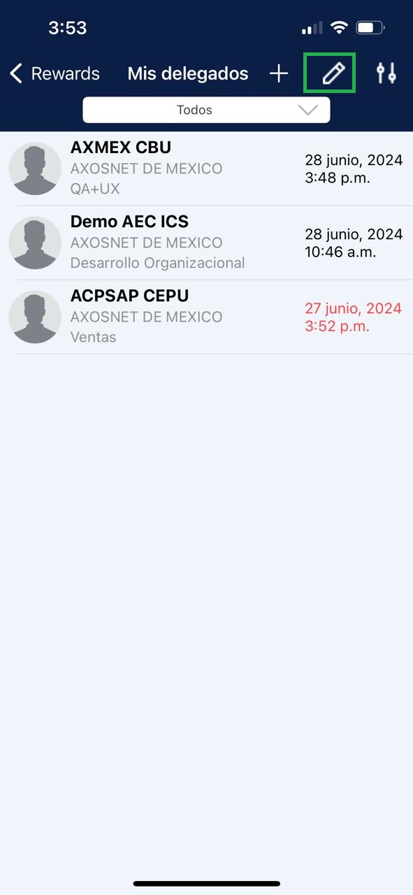 1.1. Dentro de la lista principal de Mis delegados, haga clic sobre el ícono de editar (lápiz).