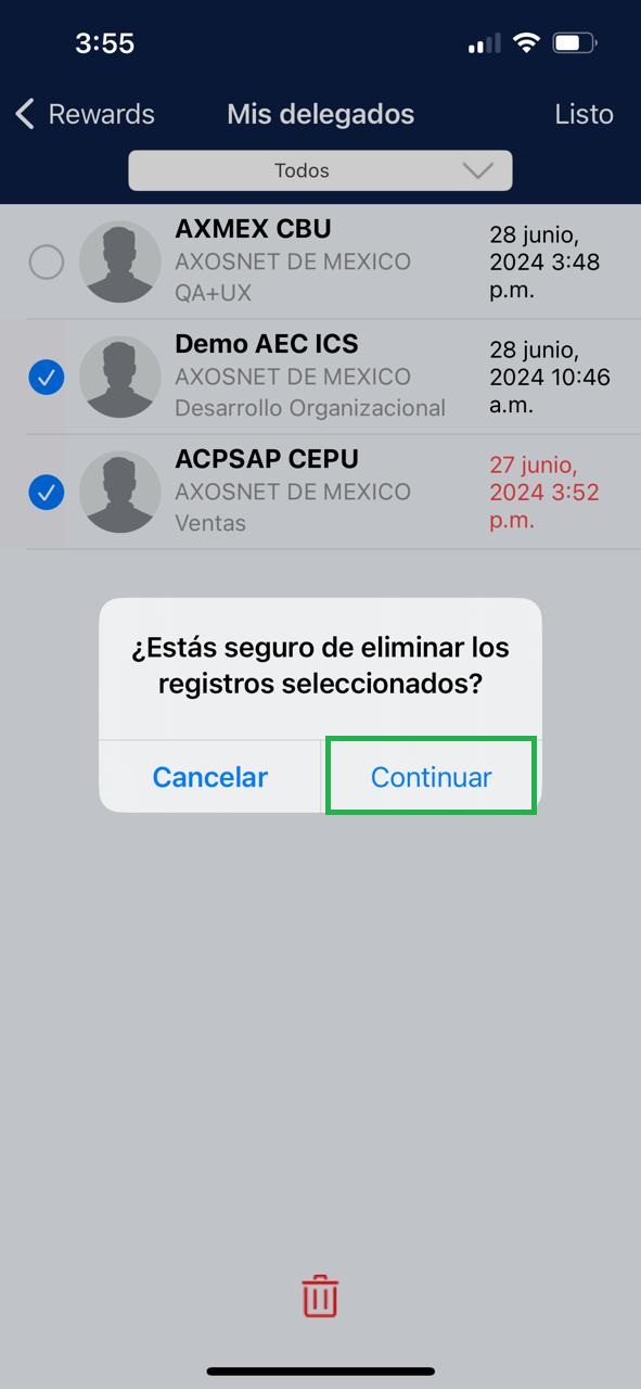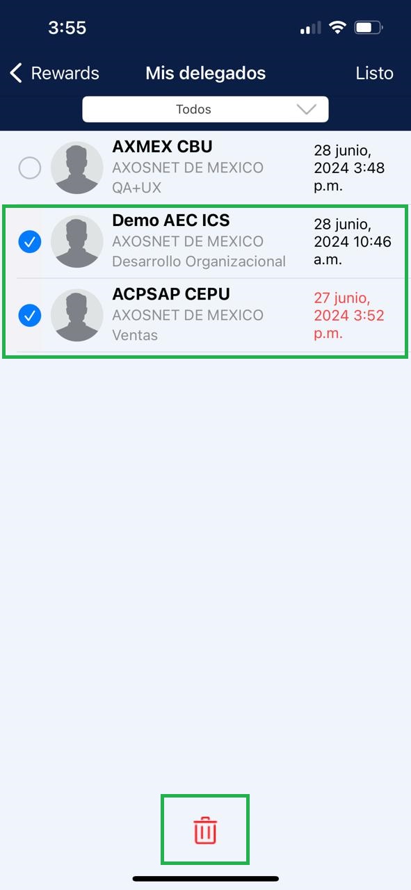1.2. Seleccione los registros de delegados que desea eliminar y haga clic sobre el ícono de eliminar.