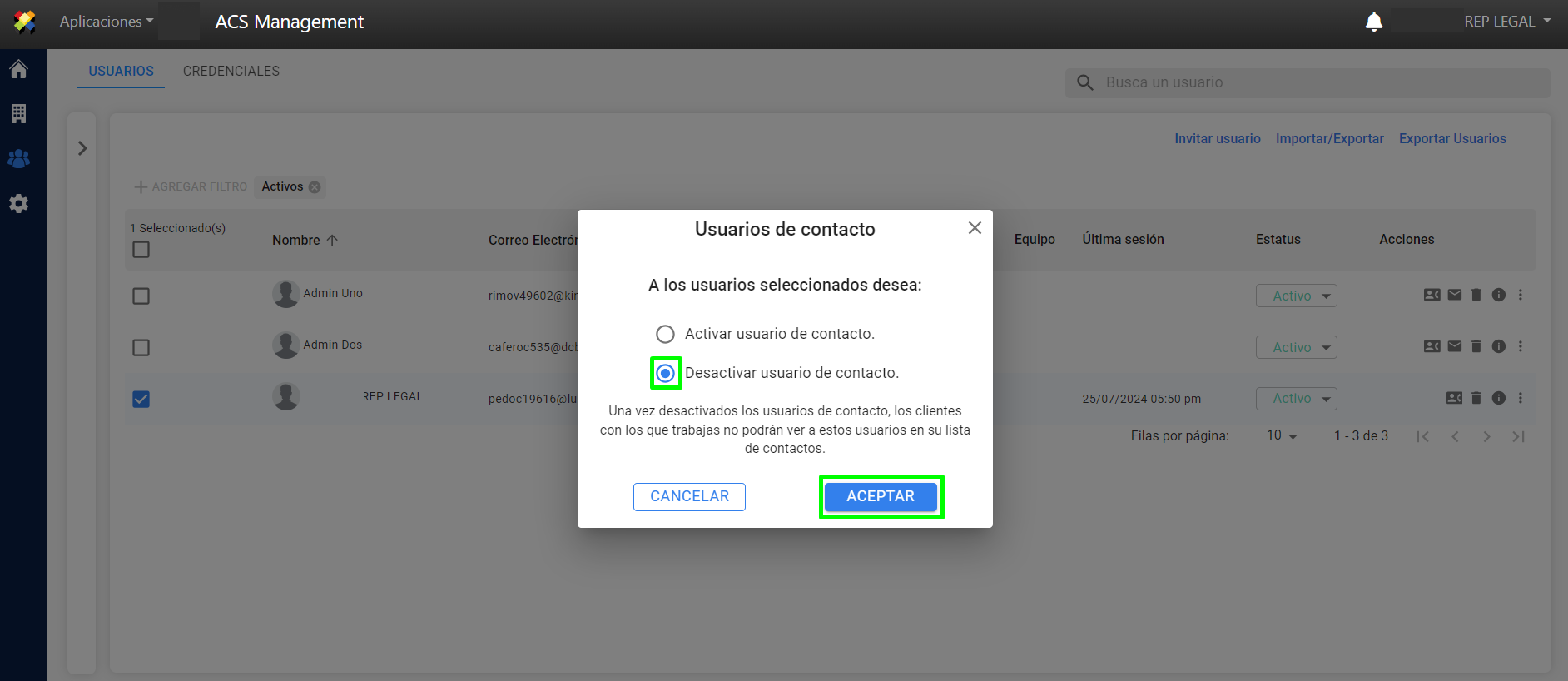 4. Se muestra la opción “Desactivar usuario de contacto” y”Activar usuario de contacto”, seleccione la opción deseada y presione el botón “ACEPTAR”.