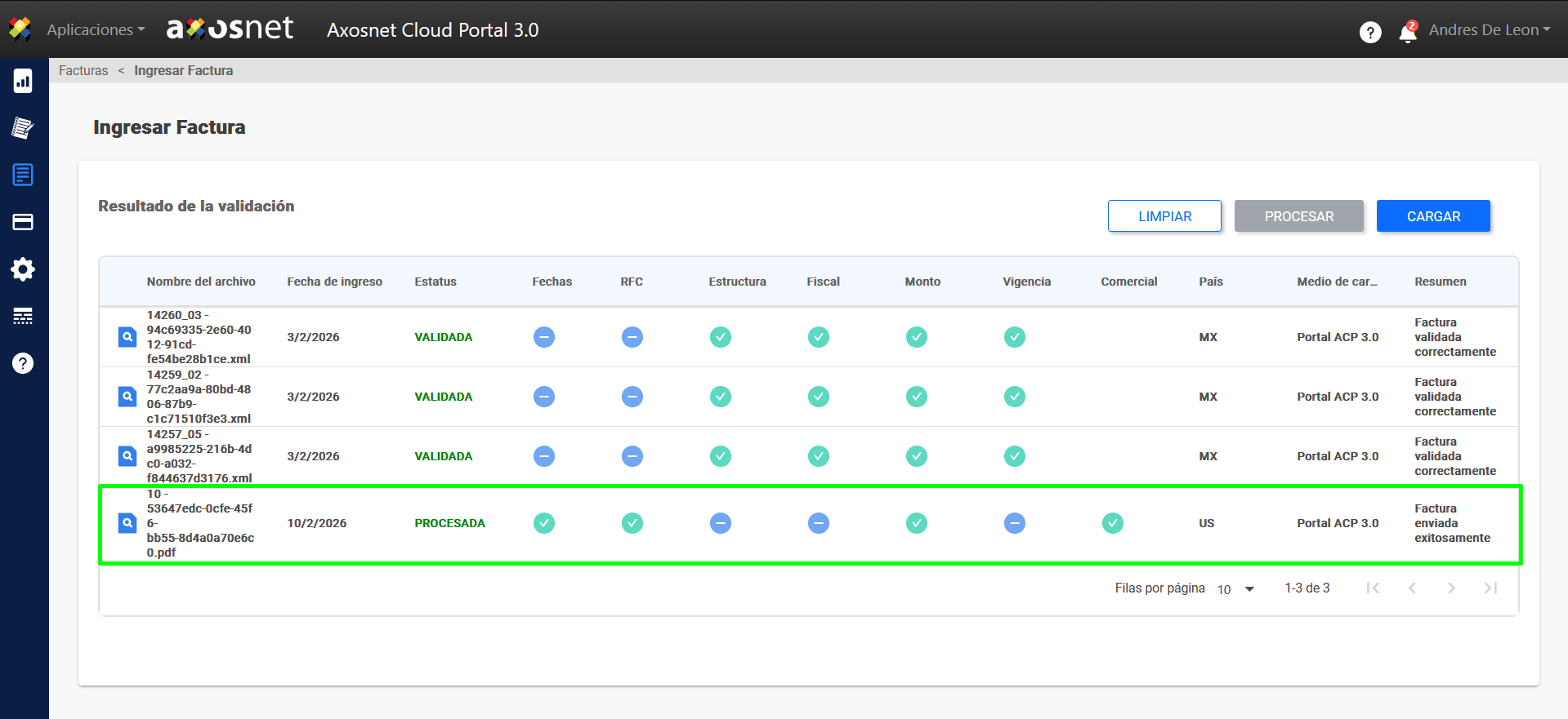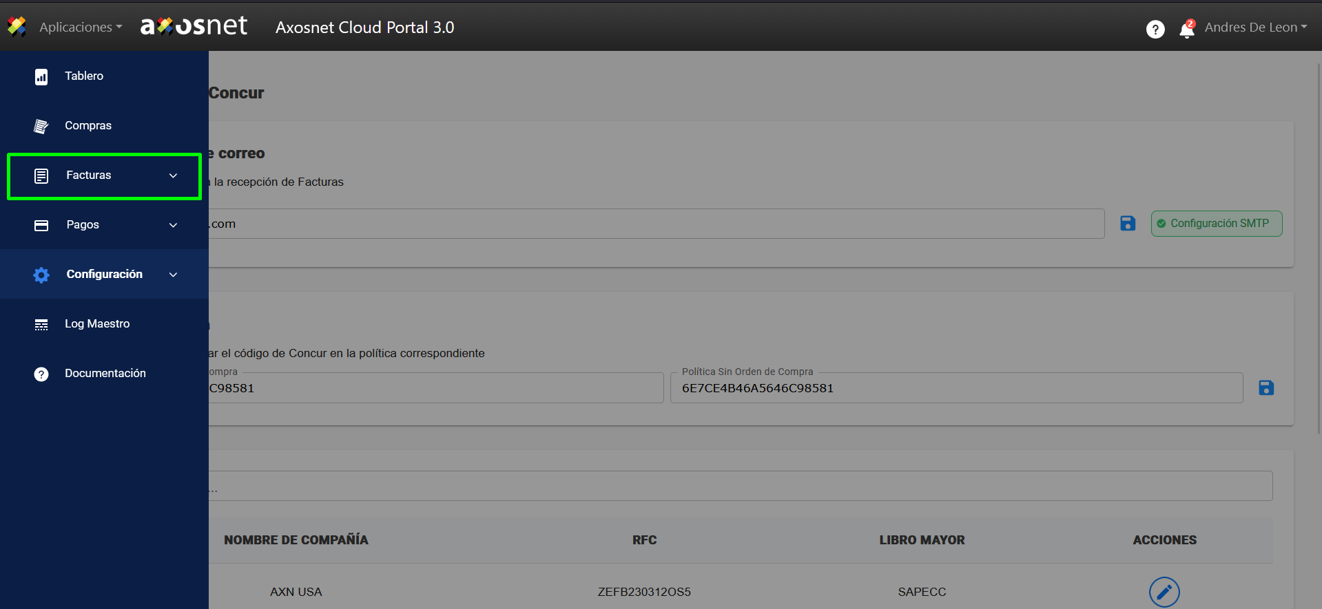4. Al procesar la factura esta será enviada al correo electrónico designado en la Configuración de Concur de Axosnet Cloud Portal y el posteo depende de Concur.
